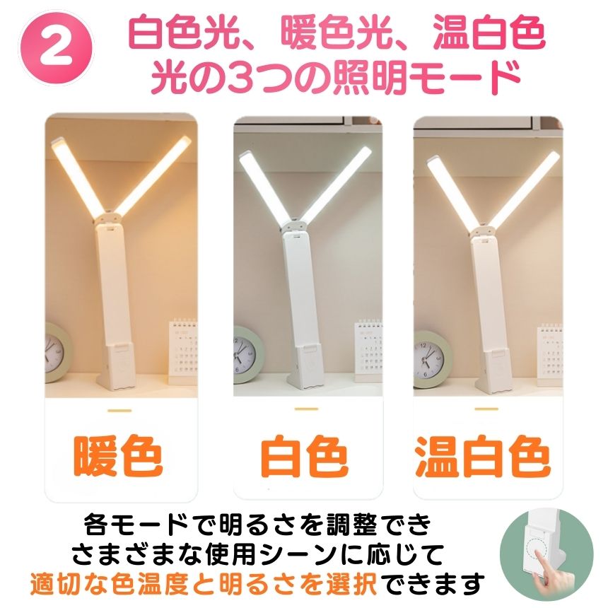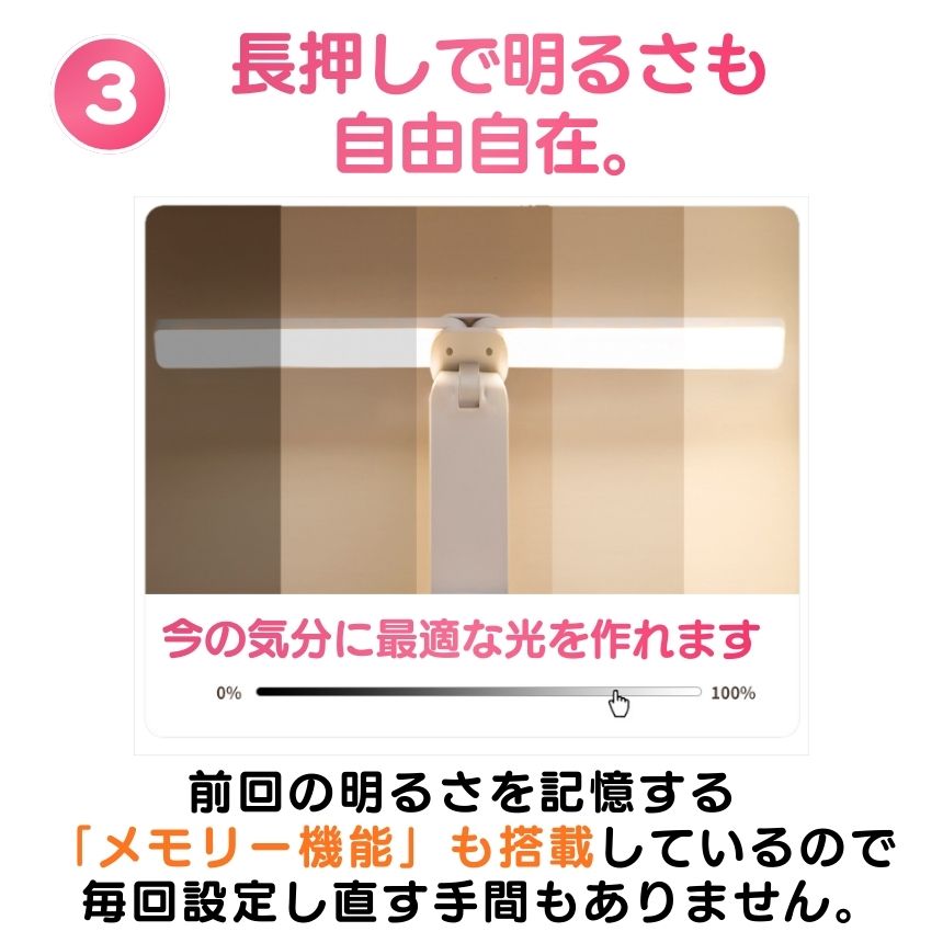 光の色は白色・暖色・昼光色の3段階から選択可能。明るさは20%から100%まで無段階で調整でき、前回の設定を記憶するメモリー機能付き。使うたびに調整し直す手間がありません。