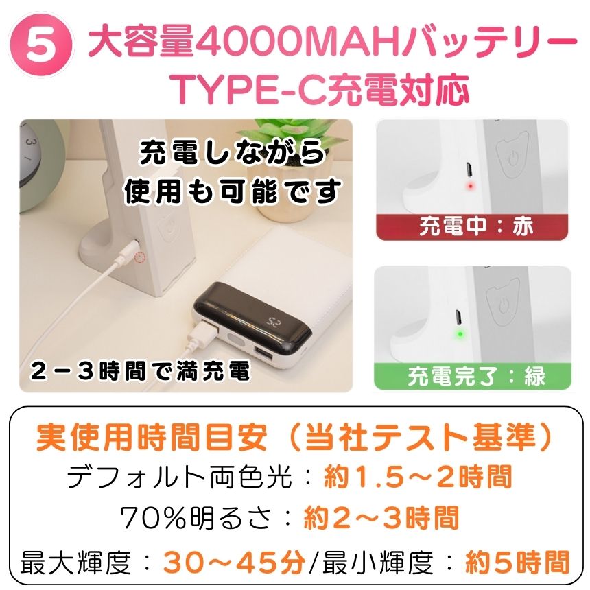 4000mAhの大容量バッテリーを内蔵し、Type-C充電に対応。コードレスで使えるため、デスクだけでなく寝室やリビング、停電時の非常灯としても活躍します。