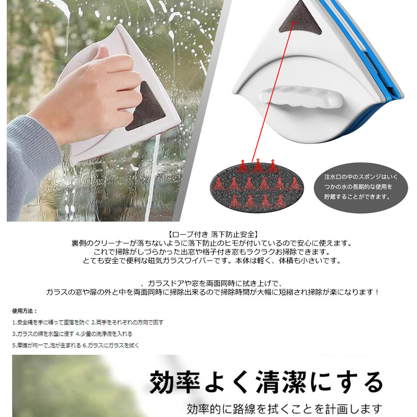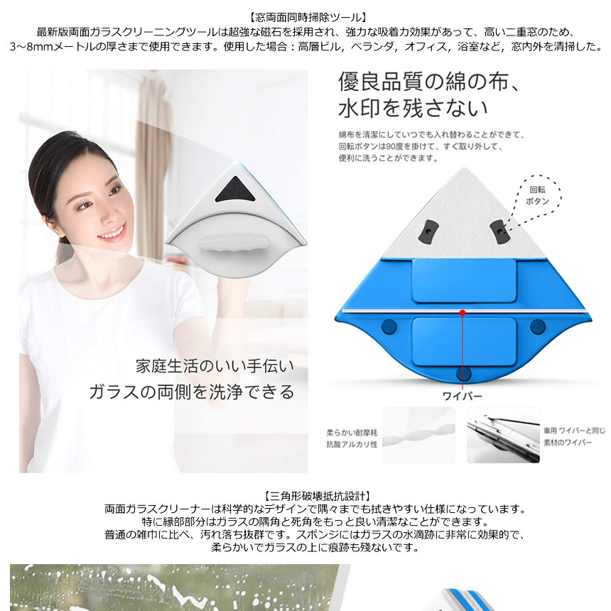両面ガラスクリーナーは科学的なデザインで隅々までも拭きやすい仕様になっています?特に縁部部分はガラスの隅角と死角をもっと良い清潔なことができます。普通の雑巾に比べ、汚れ落ち抜群です。スポンジにはガラスの水滴跡に非常に効果的で、柔らかいでガラスの上に痕跡も殘ないです。