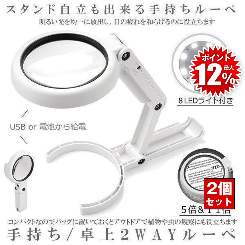 2個セット ルーペ 拡大鏡 手持ちルーペ 5倍 11倍 卓上ルーペ ハンドルーペ LED ライト付き 持ち運び 携帯 シニア 虫眼鏡 文字 新聞 読書 精密作業 2段階調光