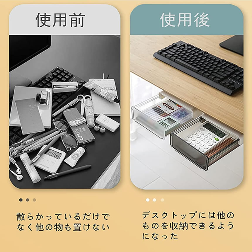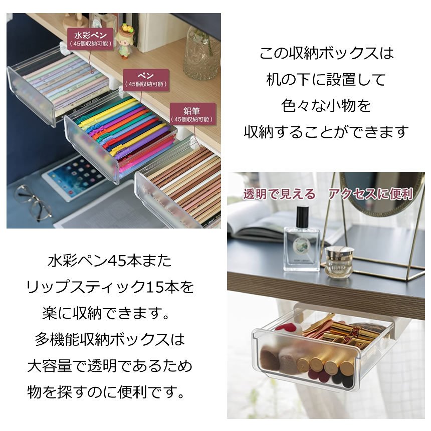 この収納ボックスは机の下に設置して、色々な小物を収納することができます。