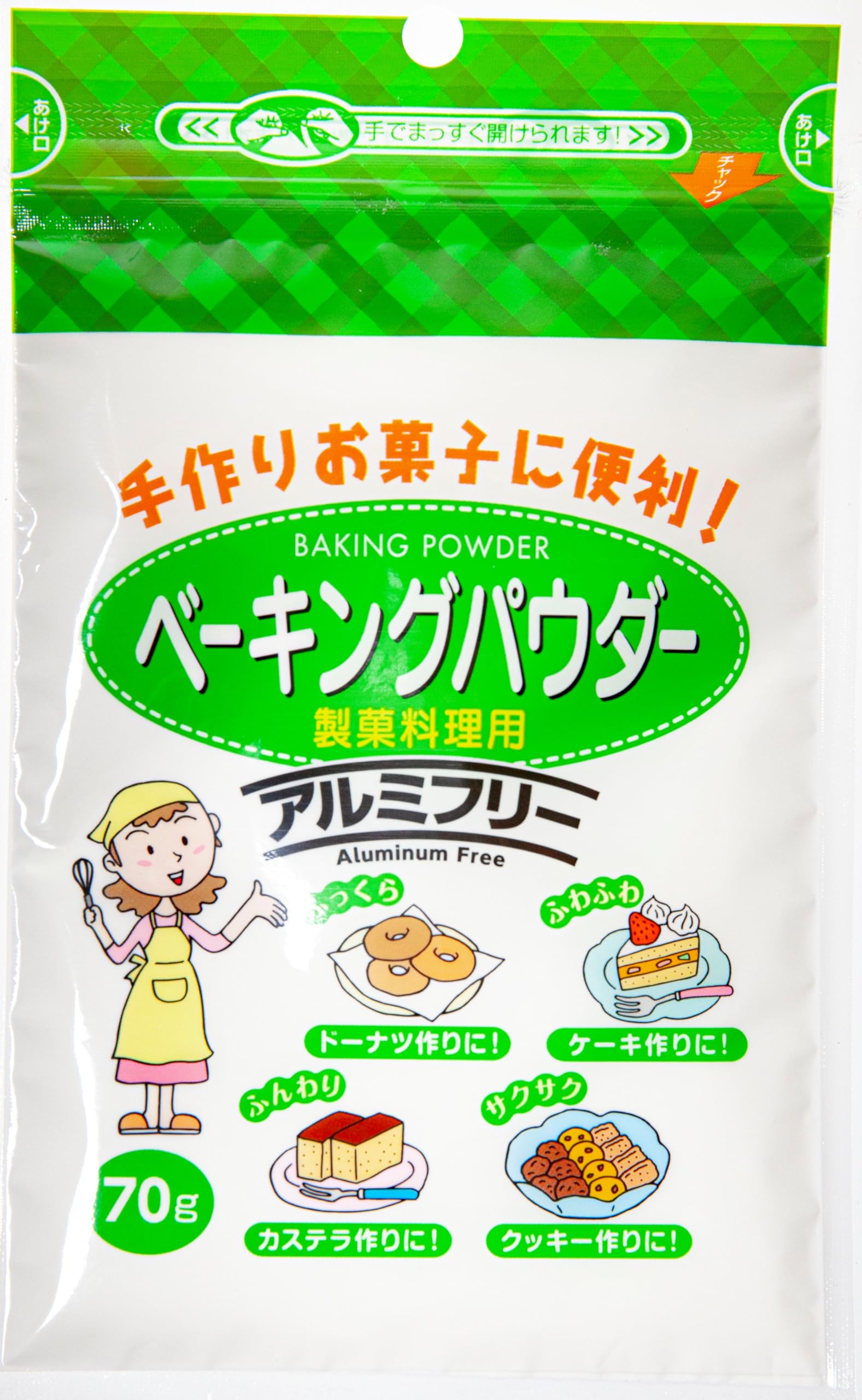 商品紹介製菓、料理用の膨張剤です。膨張剤として十分な膨張力をそなえ長く効力が続き、味への影響が少ないことなどの条件をそなえております。原材料・成分コーンスターチ(29%)/炭酸水素ナトリウム(30%)、酸性ピロリン酸ナトリウム(17%)、グルコノデルタラクトン(17%)、フマル酸(4%)、第一リン酸カルシウム(3%)使用方法小麦粉100gに対して3~4gが使用量の目安です。小麦粉に本品を入れ、ふるいにかけて十分に混ぜ合わせ水などを加えてください。お菓子や料理の種類、小麦粉の品質により、使用量を加減してください。●小麦粉と一緒にふるいにかけるとよく混ざります。●本品を先に水に入れ、後で小麦粉にまぜた場合、ふくらみに支障をきたしますのでご注意ください。●本品は乾燥した所に保管してください。