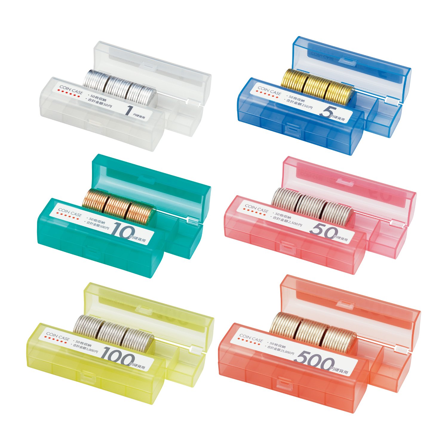 1円~500円まで各種類50枚づつ収納でき、10枚毎に仕切が付いているコインケースセットです。角型なので取り扱いや収納にとても便利です。抗菌加工でいつでも清潔規格:9本6種類セット内容:1円/10円/100円用=各2個、5円/50円/500円硬貨用=各1個色:1円硬貨用ケース=透明、5円硬貨用ケース=青、10円硬貨用ケース=緑、50円硬貨用ケース=桃、100円硬貨用ケース=黄、500円硬貨用ケース=赤外形寸法:1円硬貨用ケース=幅84×奥23×高23mm、5円硬貨用ケース=幅84×奥25×高25mm、10円硬貨用ケース=幅84×奥27×高27mm、50円硬貨用ケース=幅95×奥25×高25mm、100円硬貨用ケース=幅93×奥26×高26mm、500円硬貨用ケース=幅100×奥30×高30mm