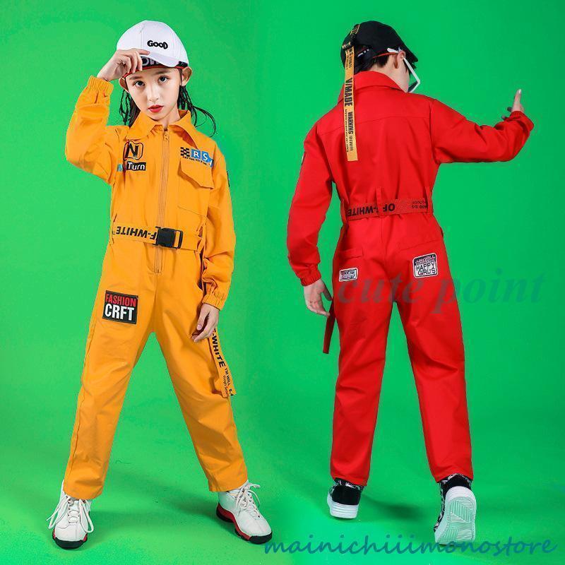 つなぎ ヒップホップダンス衣装 キッズ ダンス衣装 作業服 オーバーオール 男の子 女の子 赤 黄色 オレンジ