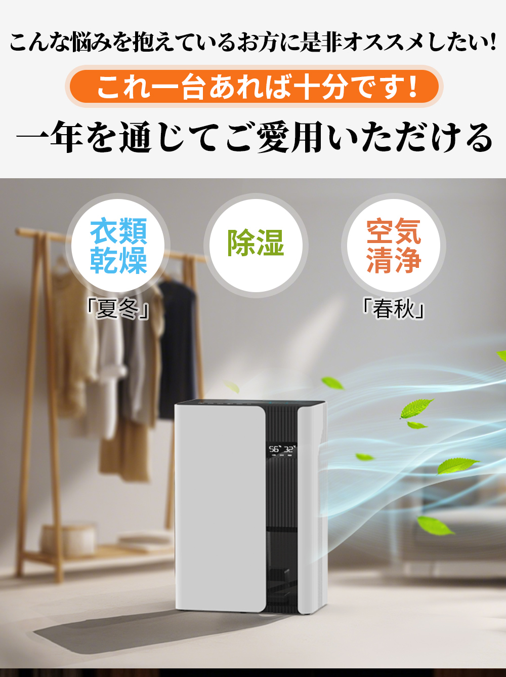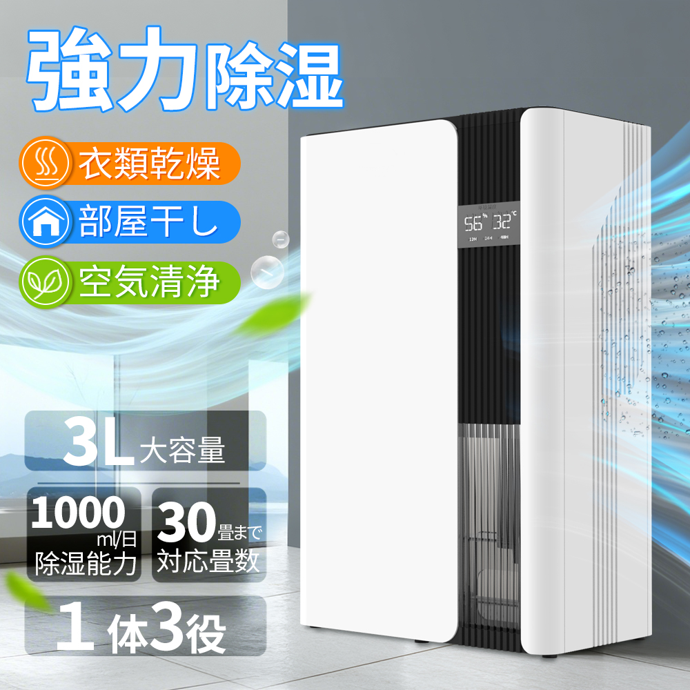 除湿機 衣類乾燥 3L大容量 最大1000ml/日 空気清浄 1台3役 除湿 省エネ 湿気対策 自動停止 排水機能付き 部屋干し デュアルコア除湿機