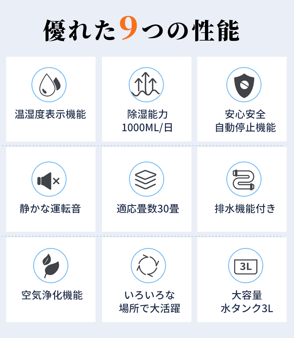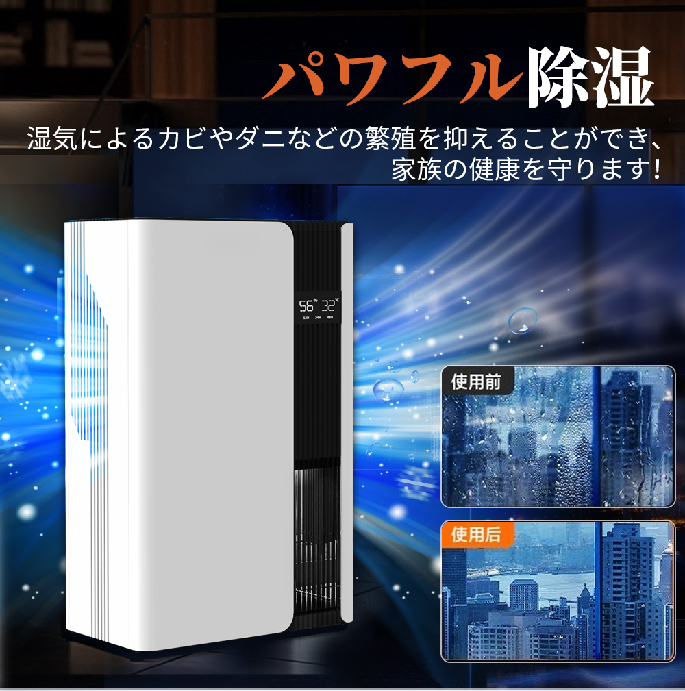 2025年最新型除湿器、3L大容量タンクが搭載され、一日最大約1Lの強力除湿力、従来製品より効率アップで、梅雨、雨季、湿度高い夏の室内など場合、カビ、家の湿気除湿対策、結露対策、梅雨対策として大活躍!過湿で起こる問題が解決可能で、カビ、ダニなど生えやすい過湿環境から解放!