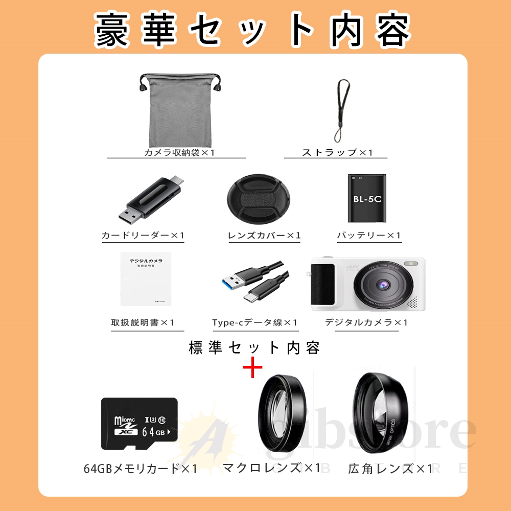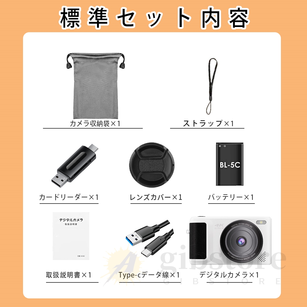 カメラ本体、type‐C 充電ケーブル, キャンバスバッグ、レンズカバー