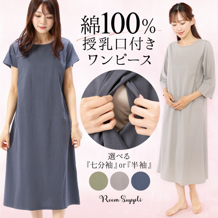 マタニティ ワンピース 授乳口付き パジャマ ネグリジェ 半袖 七分丈 春 夏 秋 綿100% 天竺ニット素材 ロング丈 入院 M〜L LL x2-72319all 圧縮