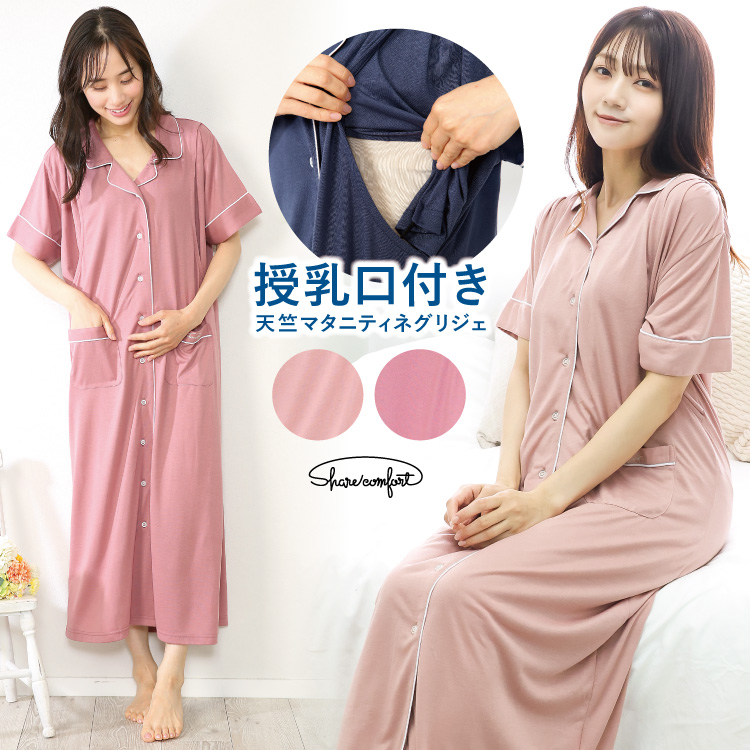 マタニティ ネグリジェ パジャマ 授乳口付き 半袖 夏向き 春夏 前開き ロング丈 可愛い 天竺ニット 無地 入院 産前 産後 プレゼント w2-77509 圧縮