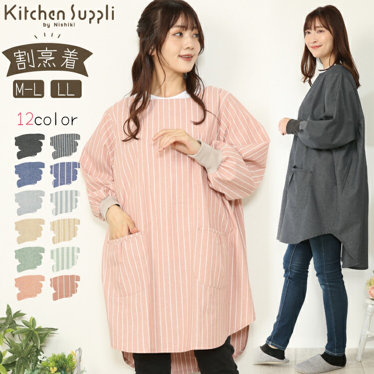 割烹着 かわいい ロング おしゃれ オーバーサイズ リブ袖 かぶり レディース エプロン スモック 無地 保育士 介護士 給食 学校 w4-kk2212 圧縮