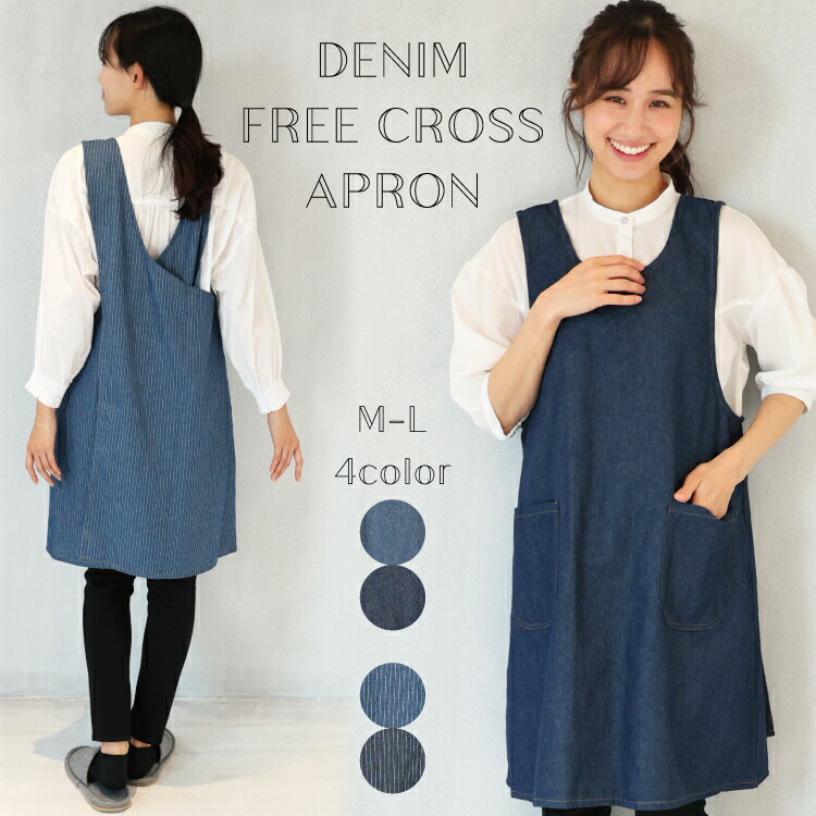 エプロン かぶるだけ おしゃれ かわいい レディース デニム フリークロス ワンピース ロング丈 無地 ヒッコリー 体型カバー 介護士 保育士 母の日 x8-n12093all