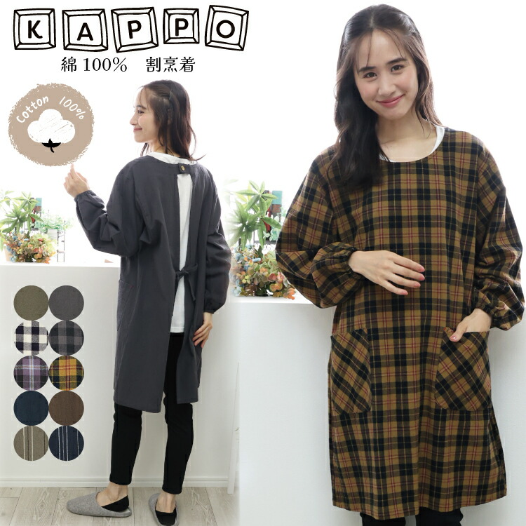 割烹着 おしゃれ 綿100% 秋 90丈 かわいい レディース スモック 無地 ストライプ チェック ルームウェア 保育士 介護士 給食 学校 家事 M〜Lx6-n24514all