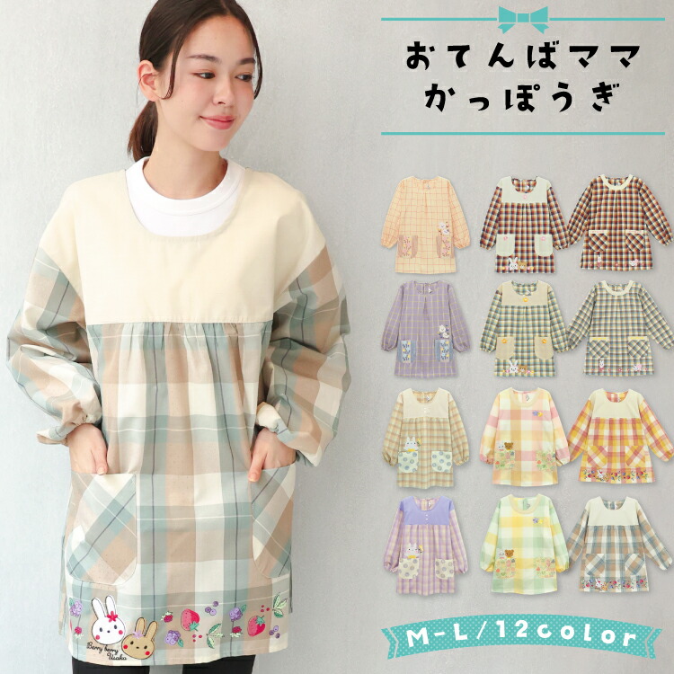 割烹着 保育士 おてんばママ スモック かわいい かっぽう着 前開き エプロン 長袖 レディース 大人 ポケット付き くま うさぎ 介護士 看護師 x5-wa9001all