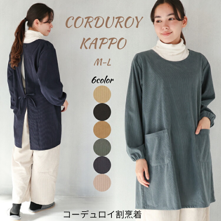 割烹着 ロング 暖かい 保育士 おしゃれ かわいい コーデュロイ リブ付き 後ろボタン レディース スモック 長袖 エプロン 介護士 給食 学校 家事 x9-wck025 圧縮