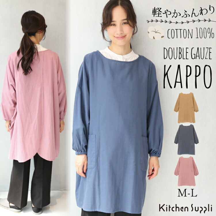 割烹着 保育士 おしゃれ かわいい ワンピース かぶり 綿100% ダブルガーゼ ロング丈 軽い 軽量 無地 コットン ゆったり 大人用 保育園 介護 母の日 x9-wgk019