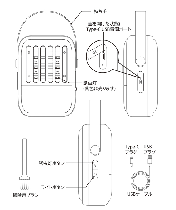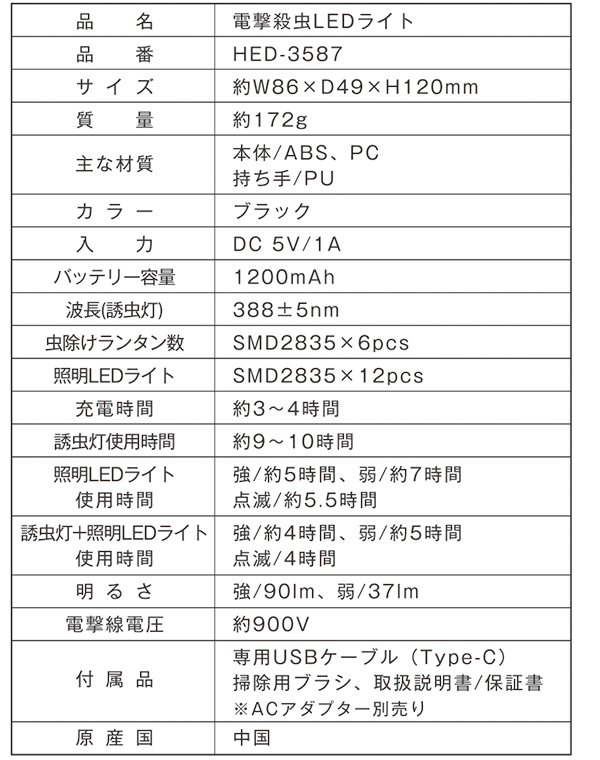| 商品説明 | 【もう虫に悩まされない!電撃殺虫LEDライトで快適な空間を実現】 従来の殺虫器では難しかった、美しいデザインと高機能を兼ね備えた、この紫外線ライトで虫を誘引し、電撃で駆除する画期的なアイテムです。従来の殺虫剤とは異なり、化学薬品を使用せず、小さなお子様やペットがいるご家庭でも安心してお使いいただけます。 【紫外線ライトで虫を誘引し、強力な電撃で一撃退治!】 ・電池式だから、場所を選ばずにどこでも使える ・充電式だから、ランニングコストも抑えられる ・LEDライト付きだから、夜間でも安心 ・コンパクトで軽量だから、持ち運びもラクラク 【落ち着いた室内空間で快適に過ごせる】 ・虫に刺される心配がなくなり、安心して過ごせる ・虫の死骸や糞による汚れから解放される ・清潔な空間で快適な睡眠をとれる 【夜間でも安心して虫対策ができる】 ・虫の嫌な音や羽音に悩まされることがなくなる ・虫に刺される恐怖や痒みから解放される ・殺虫剤の臭いを気にせずに使える 【子供やペットにも安心の電撃殺虫方式】 ・小さなお子様やペットが誤って殺虫剤を口に入れてしまう心配がない ・化学薬品による健康被害への不安から解放される ・虫よけ効果が長時間持続する これまでのように、手動で虫を退治する必要がなくなります。 また、化学物質を使用した虫除けスプレーや、不快な匂いと健康への懸念を伴う蚊取り線香も不要に。この電撃殺虫LEDライト一つで、虫の問題を解決し、より健康的で快適な生活を手に入れられます。 【詳細】 本体サイズ:約幅86×高さ120×奥行49mm 本体重量:約172g 素材・成分:本体:ABS、PC 持ち手:PU 【仕様】 入力:DC5V/1A バッテリー容量:1200mAh 波長(誘虫灯):388±5nm 虫除けランタン数:SMD2835×6pcs 照明LEDライト:SMD2835×12pcs 充電時間:約3〜4時間 誘虫灯使用時間:約9〜10時間 照明LEDライト使用時間:(強)約5h/(弱)約7h/(点滅)約5.5時間 誘虫灯+照明LEDライト使用時間:(強)約4h/(弱)約5h/(点滅)約4h 明るさ:(強)90lm/(弱)37lm 電撃線電圧:約900V 付属品:専用USBケーブル(Type-C)、掃除用ブラシ、保証書付き取扱説明書※ACアダプター別売り 保証期間:6ヶ月 【注意事項】 ●本製品を分解、修理、改造はしない。 ●本製品を本来の用途以外に使用はしない。 ●小さなお子様だけでの使用はお控えください。 ●異常、故障時には直ちに使用を中止する。 ●お手入れやUSBコネクタを抜き差ししない。 ●充電後は必ずUSBコネクタを抜く。 ●濡れた手でUSBコネクタを抜き差ししない。 ●本製品を分解、修理、改造しない。 ●USBコネクタのほこりは定期的にとる。 ●充電時、充電ケーブルは根本まで確実に差し込む。 ●充電ケーブルを抜き差しする時は、必ずUSBプラグを持つ。 ●子供など取扱に不慣れな方だけで使わせない。 ●前ガードを取り付けずに運転しない。 ●水まわり、風呂場など湿気のある場所では絶対に使用しない。 ●すき間などから指や金属などの異物を入れない。 ●髪をガードに近づけない。 |