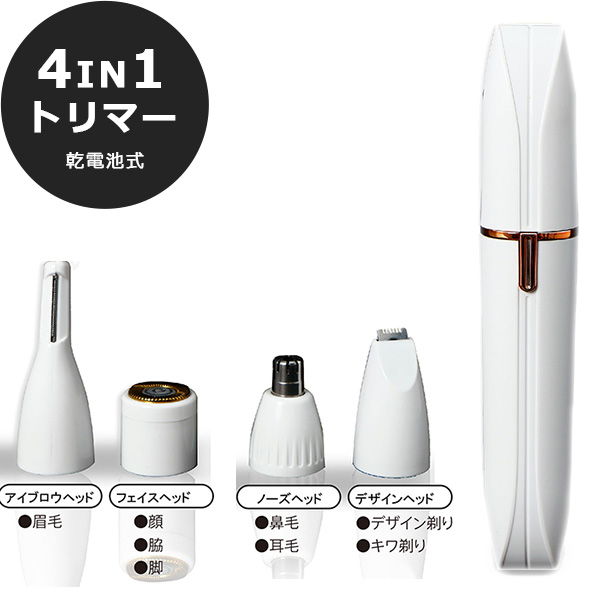 トリマー 乾電池式 4in1 アイブロウ フェイス ノーズ デザインヘッド 4つのアタッチメント 軽量コンパクト 男女兼用 HDL-4W02-HW