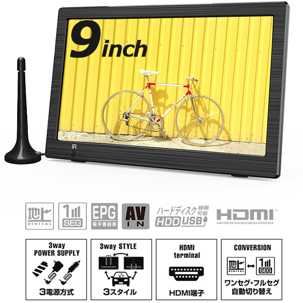 | 商品説明 | いつでも!どこでも!「楽しみ」を手放せない!! 持ち運びに便利なコンパクトサイズのポータブルテレビ プライベートスペースやアウトドア、キッチンで! ワンセグ・フルセグ自動切り替え ■好きなテレビ番組をどこでも 1 自立スタンド 背面の自立スタンドで場所を選ばず視聴が可能です。 2 壁掛け 背面の自立スタンドを使用することで壁掛けも可能です。 3 車載バッグ 車載バッグとカーアダプター使用で車内も視聴可能です。 ■便利に使える多機能設定 ・録画機能 USBメモリやハードディスクを接続してテレビ番組の録画ができます。 動画・音声・画像ファイルの再生が可能です。 ※USBメモリ、ハードディスクは別売です。 ・3電源方式、サブモニター使用 内蔵バッテリー・AC電源・カーアダプタ3方式で電源供給できます。 ・サブモニター使用 HDMI接続でパソコンのサブモニターとしても利用可能です。 ※HDMIケーブルは別売です。 ・フルセグ/ワンセグ 自動切り替え 【サイズ】 外形寸法:約224×26.5×144mm パッケージサイズ:262×80×262mm 3辺合計604mm 液晶パネル:9インチ 重量】 本体:約450g 【仕様】 電源:ACアダプター 入力AC100-240V 50/60Hz 出力DC12V 1A カーアダプター 入力DC12V 出力12V 1.2A バッテリー 2000mAh 7.4V 満充電時間約3.5〜4時間 連続使用時間約2時間 待機消費電力:1W以下 消費電力:約12W スピーカー:2W×2(ステレオ) 入力端子:アンテナ、DC電源、USB×2(番組録画、メディア再生)、AV、HDMI、イヤホン、minB-CASカードスロット 対応フォーマット:音声 MP3/WMA/WAV/AAC 動画 MPG4/WMV/AVI/3GP 画像 JPEG/BMP テキスト TXT ※上記形式でも再生できない場合があります。 ※すべての再生の保証はしておりません。 受信周波数:地上デジタル UHF(13〜62ch)(フルセグ/ワンセグ) ※インターネット回線を利用した地デジ受信環境には非対応。 ■生産地:中国 ■素材・成分:【仕様】 液晶パネル:タイプ TFT-LCD フレームレート 60Hz アスペクト比 16:9 解像度 800×480画素 輝度 200cd/m2 コントラスト比 400:1(Typ:)TM 応答速度 16(Typ.)(Tr+Td)ms 視野角 13/15/45/45(min)(CR≧10) 録画用ハードディスク容量:(※地デジ録画用ポート 〜500GBまでのメモリーを推奨)2TBまで動作テストしていますが表示に数十秒、時間を要します。 ※大容量になるほどリスト表示は遅くなります。(データ再生用ポート 〜32GBまでのメモリーを推奨) 許容範囲温度:0〜40℃ リモコン到達距離:3m以内(本体リモコン受光部正面から) 付属品:ACアダプター、カーアダプター、リモコン(動作テスト用電池を含む)、AVケーブル、車載用バック、簡易アンテナ、イヤホン、miniB-CASカード、取扱説明書兼保証書 ■パッケージ:個別箱 |