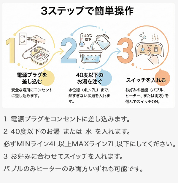 | 商品説明 | ━━━━━━━━━━━━━━━━ 買ってから後悔しない足湯を選ぶ お湯スタート前提で 迷わず温まるフットバス ━━━━━━━━━━━━━━━━ 足湯は、続く形にすると生活に残ります。 液晶や複雑なタイマーで迷うより、 お湯を注いで、スイッチを押して、温まる。 その最短ルートだけを残したのがRM-239Hです。 ━━━━━━━━━━━━━━━━ 重要 購入前に必ずご確認ください 納得できない方は この商品を選ばないでください ━━━━━━━━━━━━━━━━ この製品は、すべての方に向けたものではありません。 以下の仕様を不便と感じる方は、購入後の満足度が下がるおそれがあります。 ■ 温度調節機能はありません 任意の温度設定はできず、ヒーターが水温を約43度に保つ目安で働きます。 ■ 常温の水から約43度までは 30分から40分 程度かかります 水温や気温によって所要時間は前後します。 ■ 早く使いたい方は 40度以下のお湯 を入れて使うのが前提です 待ち時間を避けたい方は、給湯器のお湯を使用してください。 ■ 水量は必ず MINライン4L以上 MAXライン7L以下 少なすぎる、多すぎるは、故障やトラブルの原因になります。 ■ 入浴剤 アロマオイル等の香料 薬剤は使用できません 事故やトラブルの原因になります。 ■ 連続使用は1時間まで 長時間の連続使用は避けてください。 ■ 熱湯は入れないでください やけどの原因になります。 ここに納得できる方だけが、壊しにくく迷わない道具として快適に使い続けられます。 ━━━━━━━━━━━━━━━━ こんな人におすすめ ━━━━━━━━━━━━━━━━ ■ 足湯を初めて買うが、操作で迷うのは避けたい方 ■ お湯を注ぐ手間はOKで、足湯中のぬるさを減らしたい方 ■ 出しっぱなしにせず、薄く畳んで片付けたい方 ■ 入浴剤なしでも、水道水だけで清潔に使い切りたい方 ━━━━━━━━━━━━━━━━ 選ばれる5つの理由 ━━━━━━━━━━━━━━━━ ■ 理由1 説明書いらずの2スイッチ操作 操作はバブルとヒーターの物理スイッチのみ。 届いたその日から直感的に使えます。 ■ 理由2 約43度を目安に温めて保つヒーター設計 足湯中にぬるくなって、心地よさが落ちる。 そのストレスを減らすためのヒーター設計です。 ※温度調節はできません。 熱く感じる場合は、足を出すかヒーターを切って調整してください。 ■ 理由3 収納時は約10cmの薄さ 使用時はしっかり深さがあり、折りたたむと薄く収まります。 ソファの下や家具の隙間に入れやすく、出しっぱなしになりにくい設計です。 ■ 理由4 家族で使える28cmサイズ 足のサイズは28cmまで対応。 男性でも窮屈さを感じにくく、ご家族やパートナーと共有しやすい仕様です。 ■ 理由5 機能を削ったからこその壊しにくさ 液晶や複雑な回路を増やさず、香料や薬剤も入れない前提。 ルールを守って使うことで、長く愛用しやすいモデルです。 ━━━━━━━━━━━━━━━━ 賢い使い方 お湯から始める 待ち時間をゼロにするコツ ━━━━━━━━━━━━━━━━ この商品で一番多い失敗は、水から温めようとすることです。 常温の水から約43度まで温めるには 30分から40分 程度かかります。 早く気持ちよく使うコツは1つだけ。 40度以下のお湯を入れてから使う これで、スイッチを入れた瞬間から足湯が始まります。 ━━━━━━━━━━━━━━━━ 使い方 3ステップ ━━━━━━━━━━━━━━━━ 1 電源プラグをコンセントに差し込みます 2 40度以下のお湯 または 水 を入れます 必ず MINライン4L以上 MAXライン7L以下 にしてください 3 お好みに合わせてスイッチを入れます バブルのみ ヒーターのみ 両方 いずれも可能です ━━━━━━━━━━━━━━━━ 長く使うための使い方 故障と事故を避けるポイント ━━━━━━━━━━━━━━━━ ■ 使用後は毎回水を捨てて、内側の水分を拭き取ってください ■ 本体を持ち運ぶときは、フットカバーの持ち手を持ってください 水が入った状態での移動は危険です ■ コードを引っ張らず、プラグを持って抜き差ししてください ━━━━━━━━━━━━━━━━ スタッフVoice ━━━━━━━━━━━━━━━━ 正直に言うと、この商品は何でもできる足湯ではありません。 温度調節はできない。 水から温めると時間もかかる。 でも、その代わりに、迷う要素を徹底的に減らしました。 バブルとヒーターの2スイッチだけ。 押せば動く。だから続く。 おすすめの使い方は、最初から40度以下のお湯を入れること。 これだけで待ち時間のストレスが消えて、足湯が日常に入りやすくなります。 入浴剤やアロマが使えないのも、好みが分かれる点です。 一方で、余計なものを入れないから掃除がラクで、故障リスクも抑えられます。 片付けも、折りたたみ約10cm。 出しっぱなしになりにくいので、続けたい人ほど相性が良いと思います。 買ってから後悔しないために、制限も全部先に出しまし
