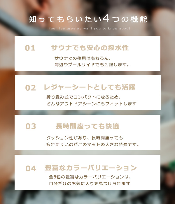 | 商品説明 | 【サウナマットに最適!折畳みクッションマットが新登場】 レジャータイムをもっと快適に、もっと手軽に。サウナからアウトドアまで、どんなシーンでも大活躍する折りたたみクッションマット。驚きの軽さとコンパクトさで、持ち運びも楽々。しかも、8色から選べるカラーバリエーションで毎日が楽しくなること間違いなし! 【サウナでも安心の撥水性】 この折りたたみクッションマットは、発砲ポリウレタン製を使用しています。この素材は、その撥水性に優れているため、水にぬれてもマット自体はしっかりと保護されます。サウナでの使用はもちろん、海辺やプールサイドでも活躍します。そして直接座る必要がなくなるので、衛生的にサウナを楽しむことができます。また、防水加工が施されているので、突然の雨に見舞われた時や登山中など、どんなシチュエーションでも安心してお使いいただけます。 【レジャーシートとしても活躍】 折り畳み式でコンパクトになるため、どんなアウトドアシーンにもフィットします。キャンプやハイキングでの休憩時間、ピクニックやお花見での座り心地、運動会やBBQでのゆったりとした時、野外ライブでのリラクゼーション、とにかくこのマット一つで様々なシーンを快適に過ごせます。 【長時間座っても快適】 クッション性があり、長時間座っても疲れにくいのがこのマットの大きな特長です。例えば運動会やお花見などで一日中同じ場所で過ごす時、長時間座っていても痛くなりにくいです。また、素材に弾力性があるため、体重をしっかりと分散させて、お尻への負担を軽減します。 【コンパクトに折り畳めて持ち運びもラクラク】 8つに折れば片手に収まるほどのコンパクトさは、移動時のストレスを減らしてくれます。しかも、重さはたったの27グラム。バッグに入れてもほとんど場所を取らず、その軽さならどこにでも連れて行けます。 【豊富なカラーバリエーション】 全8色の豊富なカラーバリエーションは、自分だけのお気に入りを見つけられるのはもちろん、大人数で色を揃えたり、その日の気分に合わせて色を変えたりと使用する楽しみも広がります。レッド、パープル、ブルー、ブラック、ピンク、カーキ、オレンジ、ライトグリーンの中から選べます。 【はみ出しても目立ちにくいクリアタイプ】 クリアタイプなので、はみ出しても目立ちにくいです。また、切り込みが入っているので、爪にしっかりとフィットします。 防水、軽量、そして心地よい座り心地。折りたたんでバッグイン、いつでもどこでも快適さを。これほど機能的で手頃な価格、もうこれなしのレジャータイムは考えられない!今すぐあなたの生活に彩りを加えてみませんか?あなたのアウトドアライフが、きっともっと楽しくなりますよ。 【商品詳細】 サイズ: 広げた時:約38×28×0.8cm 畳んだ時:約14×9.5×6cm 袋サイズ:約:横20cm×縦26.5cm 材質:XPE素材 ポリエステル不識布(収納袋) 重量:約27g |