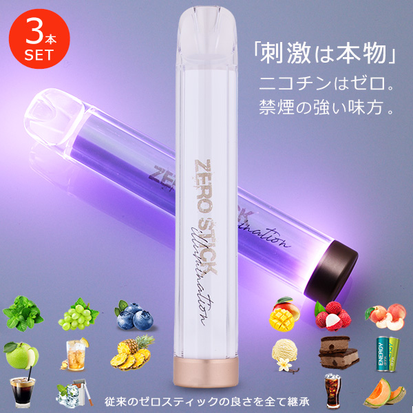 | 商品説明 | 【3本SET販売ページです。」 【新しい「ゼロ」の世界を体験!!】 - 光と香りで、ワンランク上のリラックスを- 従来のゼロスティックの満足感をそのままに、さらに魅力的な機能をプラスした「ゼロスティック IL イルミネーション」が新登場! --ゼロスティック ILのここがポイント!-- ■強烈なキック感 従来モデルを上回る喉への刺激で、本物のタバコに近い満足感を提供します。 ■長続きする満足感 従来モデルの約2倍となる1000回の吸引が可能になりました。これにより、1本でタバコ約5箱分相当を楽しめる驚異的なコストパフォーマンスを実現しています。 ■ パワフルな内蔵バッテリー 550mAhの大容量リチウム電池を搭載し、長時間の使用に耐える性能を備えています。 ■ 快適な吸引体験 口に合わせた円弧形の吸い口を採用することで、長時間の使用でも疲れにくい設計になっています。 ■イルミネーション機能 最大の特徴は、吸引時に本体が様々な色に光るイルミネーション機能です。これにより、禁煙やストレス解消がより楽しく、スタイリッシュな体験へと変わります。 禁煙中のイライラ や 日々のストレス を忘れさせてくれる、新感覚のリラックス体験をぜひお試しください。 【進化した機能性】 【圧倒的なキック感】 従来のゼロスティックを超える強烈な喉への刺激を実現しました。 喫煙者が求める「ガツンと来る」感覚を、ニコチン0でありながら見事に再現しています。この強力なキック感により、タバコからの移行がさらにスムーズになります。 【長時間、もっと楽しめる】 内蔵リチウム電池が550mAhにパワーアップ!従来品の約2倍の吸引回数(約1000回)を実現しました。より長く、深く、リラックスできます。 待ち焦がれていたリラックスタイム。もう、バッテリー残量を気にする必要はありません。1000回のたっぷり吸引回数で、心ゆくまで至福のひとときを満喫できます。 【吸うたびに光る、魅惑のイルミネーション】 ストレス解消や気分転換に欠かせないひとときに、視覚的な楽しみもプラス。吸うたびに本体が、様々なイルミネーションが織りなし幻想的な空間で、深いリフレッシュを味わえます。 【さらに快適な使い心地】 まるでオーダーメイドのように、口にフィットする円弧形の吸い口を採用。長時間の使用でもストレスを感じさせず、至福のリラックス体験へと誘います。 ■円弧形の吸い口のメリット 快適な使用感: ・口の形状に自然にフィットし、長時間の使用でも疲れにくい ・唇や歯への負担が少ない 効率的な吸引: ・空気の流れが最適化され、スムーズな吸引が可能 ・より少ない努力で満足感が得られる 漏れ防止: ・唇とデバイスの密着性が高まり、蒸気の漏れを防ぐ 衛生的: ・唾液が内部に入りにくい設計 【もちろん、従来のゼロスティックの特長もそのまま】 ・ニコチン・タールゼロ: 健康への影響を気にせず、心からリラックスできる、深いひとときを。 【豊富な16フレーバー】 16種類のフレーバーは、さまざまな好みに対応できる幅広いラインナップが魅力です。それぞれのフレーバーが持つ独自の味わいや特徴を楽しんで、お気に入りを見つけてください。 ◆トリプルメンソールミント 通常ミントの3倍強のメンソールミント。「ガツン!」とくる爽快感が楽しめる! ◆トリプルメンソールミント×ブルーベリー 爽快なミントと甘酸っぱい味わいが香り広がるブルーベリー。 ◆トリプルメンソールミント×グリーンアップル 強めのミントとアップルの芳醇な香りと爽やかな甘さが特長。 ◆トリプルメンソールミント×ジンジャー 強めのミントと刺激的なジンジャーで仕上げたクリアな刺激と、爽快さが特長 ◆トリプルメンソールミント×マスカット マスカットのすがすがしい爽やかな香りとミントのフレーバーが混然一体となり楽しめる! ◆トリプルメンソールミント×パイナップル 程よく甘味と酸味が、強めのミントと中和されリフレッシュ出来る。 ◆トリプルメンソールミント×エナジードリンク 鼻を通るとまさしくエナドリ感を満喫!後味の爽快感がクール。 ◆トリプルメンソールミント×コーラ のど越しにギュッとくるコーラの炭酸風味&キック感が味わえる。 ◆トリプルメンソールミント×マンゴー 甘く爽やか。そしてフルーティー♪口の中に程よく残るマンゴーの風味が暖かな夏を連想させる。 ◆トリプルメンソールミント×ライチ スーっと喉に通る甘みサッパリなライチ風味に強めのミントが合わさり、リフレッシュ出来る。 ◆トリプルメンソールミント×ピーチ 冷んやり強メンソールにピーチのジューシー感が見事マッチ!飽きがこない。 ◆メンソールミント×アイスメロン ミントの刺激とメロンの甘さが溶け合う、至福のひととき。 ◆メンソールミント×クーリングタバコ ミントの清涼感とタバコの深みが融合した贅沢な味わい。上品な刺激が愉しめる。 ◆メンソールミント×アイスコーヒー ミントの冷涼感と苦味の絶妙なバランス。アイスコーヒ