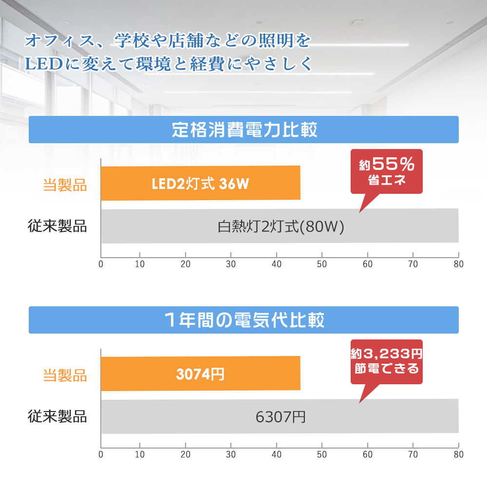 ★電気代約50%削減!省エネで経済的! 既存の蛍光灯器具と交換するだけで、電気料金が約半分以下に!照明の新設にもおすすめです。