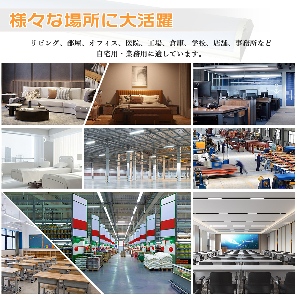 商業照明としてガレージ、病院、学校、デパート、事務所、スーパー、会社、地下駐車場、工場などによく使われています。
