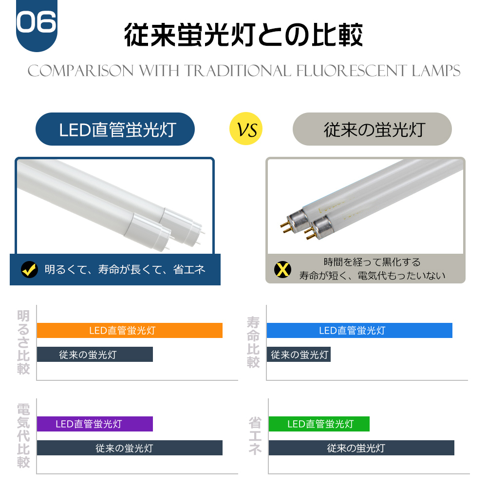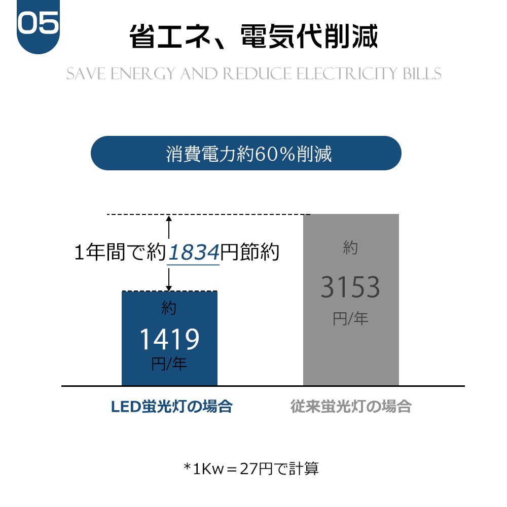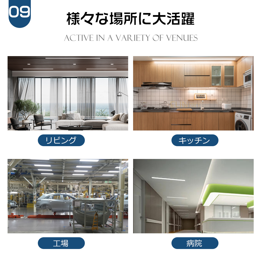 長寿命&省エネ 光源は蛍光灯に比べ消費電力が少なく長寿命なLEDです。消費電力は従来の蛍光灯と比べ、約55%を削減でき、電気代を節約でき、家計にも優しいです。長寿命を持ちますので、電気代を気にせずに長時間使えます。家庭でもビジネスでも使える!例えば、廊下、学校、会社、病院、キッチン、リビング、スーパー、工場などの直管型に幅広く応用できる。