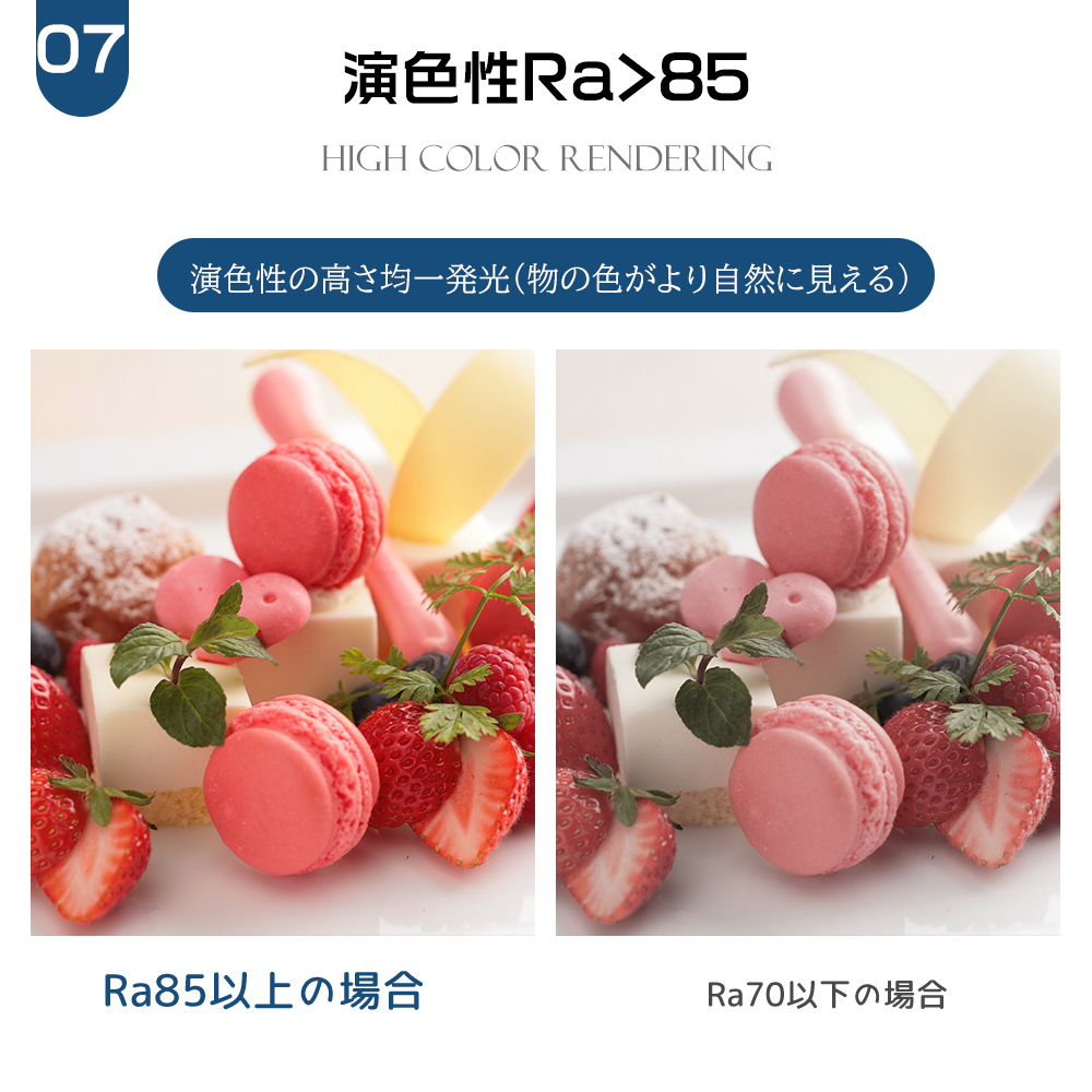 高演色 演色評価数は85Ra以上、演色性がかなり優れている。演色性は物の色の見えに影響を与え、快適な照明環境を実現するため、演色性を十分に考慮する必要があります。