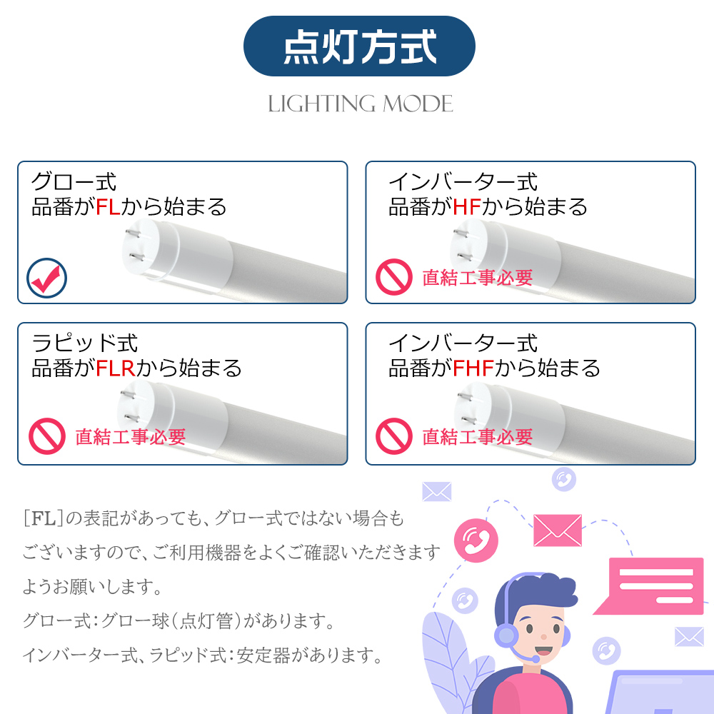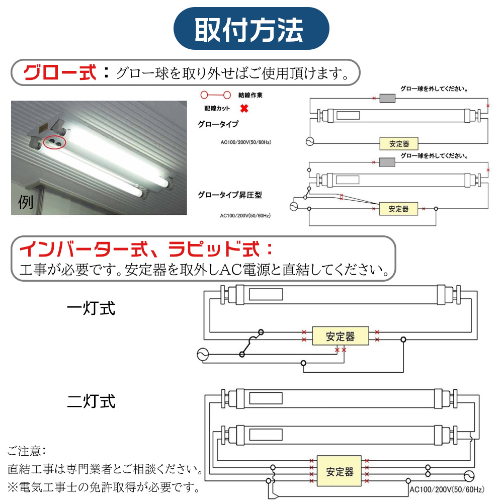 グロー式工事不要 グロー式の場合、グロー点灯管を取り外すだけで使える。 [1灯式/2灯式] ラピッド式やインバーター式の場合、直結工事が必要です!工事は専門業者に依頼してください。