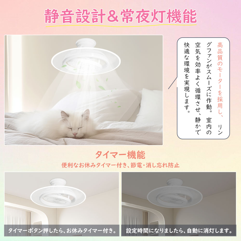 タイマー&常夜灯モード付き LEDファンライトは「ファン」と「LEDライト」を組み合わせたシーリングファンライトです。天井に設置することで風と光をお届け!循環効率がアップし、足元に置かないので邪魔にならず小さなお子様やペットがいるご家庭に最適!お部屋の空気をしっかり循環し、温度差を解消する同時、居心地の良い雰囲気を作り出す快適に。