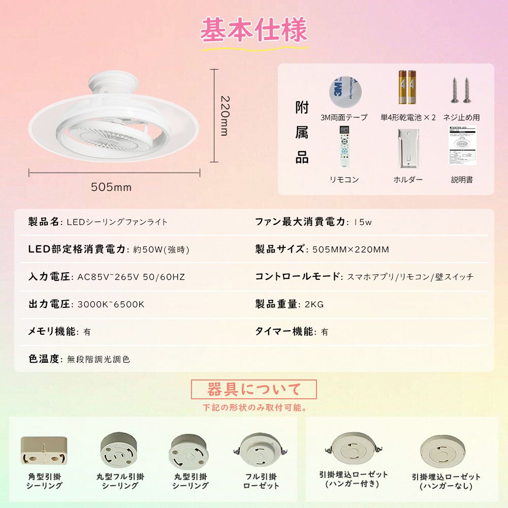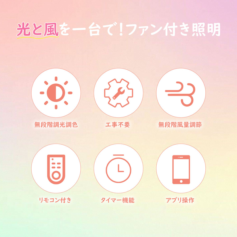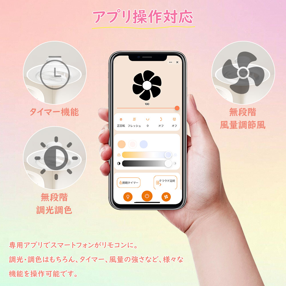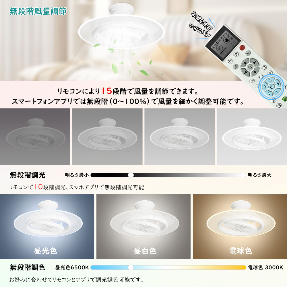 光と風を無段階でコントロール可能専用リモコンおよびスマートフォンアプリに対応し、調光・調色・風量調整を直感的に操作できます。 明るさや色温度を自由にコントロールでき、温かみのある電球色から爽やかな昼光色まで、使用シーンに合わせた最適な照明環境を演出します。 また、風量は無段階調整に対応。 やさしい微風からしっかりとした送風まで、お好みの強さに細かく設定でき、快適で心地よい空間づくりをサポートします。