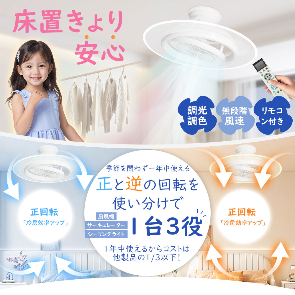 正逆回転機能搭載&オールシーズン快適設計 正逆回転機能搭載のシーリングファンライト。 夏は反時計回りで爽やかな風を届け、冬は時計回りで天井にたまった暖気を足元へ循環。 室内の温度ムラを抑え、冷暖房効率を高めて省エネに貢献します。 コンパクト設計で、リビングはもちろん、キッチン・脱衣所・トイレなどの空間にも最適。 一年中快適な空気環境を支える、オールシーズン対応モデルです。