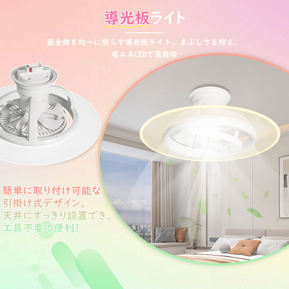 導光板採用による均一発光デザイン 本製品は、最新の導光板技術を採用し、光源のまぶしさを抑えながら、やさしく均一な面発光を実現しています。 導光板全体が発光する設計により、影ができにくく、天井や壁まで美しく照らし出します。 従来の点光源タイプとは異なり、光を広範囲に拡散。 お部屋全体をふんわりと包み込み、落ち着きのある快適な空間を演出します。 さらに、高いエネルギー効率を備え、十分な明るさと省エネ性能を両立。 照明と送風を一体化した、快適性と機能性を兼ね備えた次世代型LEDファンライトです。