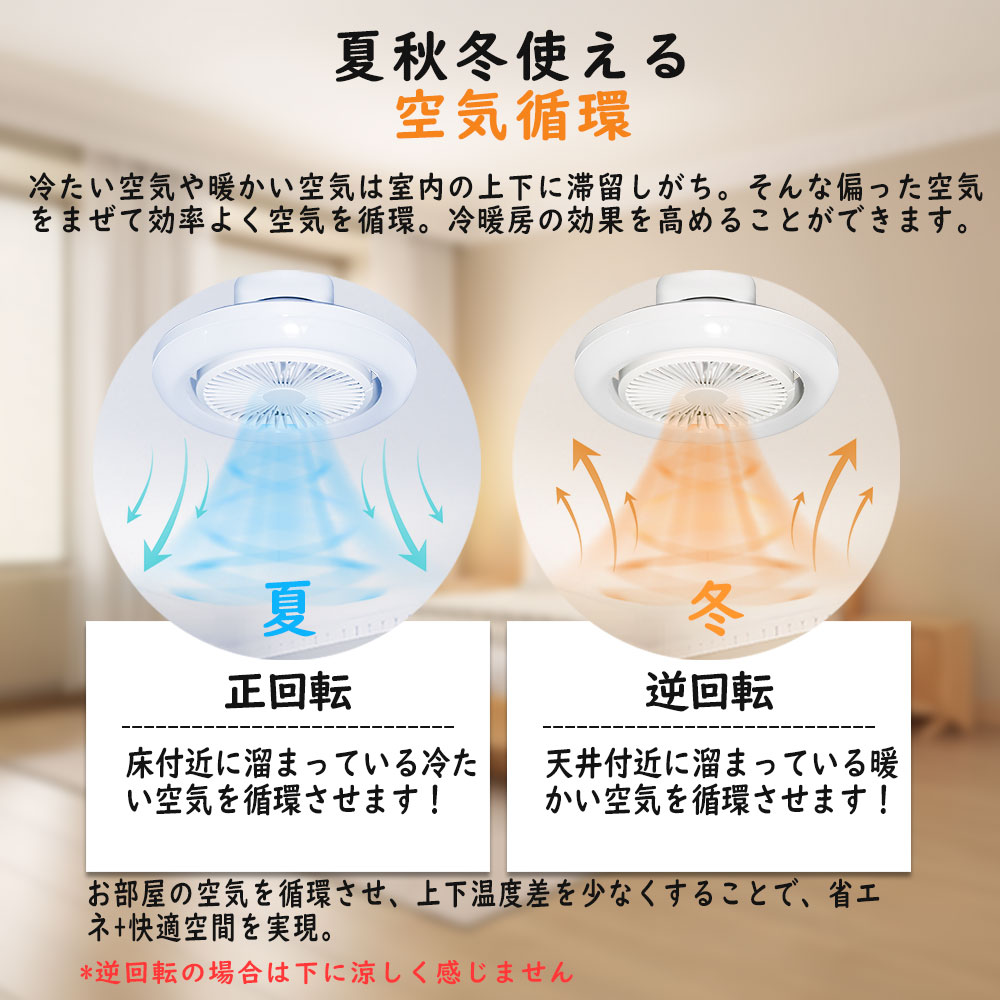 シーリングライト×サーキュレーターで快適空間夏は天井にこもった熱気を全体に広げ、部屋の隅々まで涼しい風を届けます。 冬は冷えた床の空気を吸い上げ、暖かい空気を足元に循環させて、部屋全体の温度ムラを解消します。
