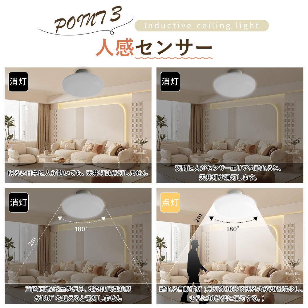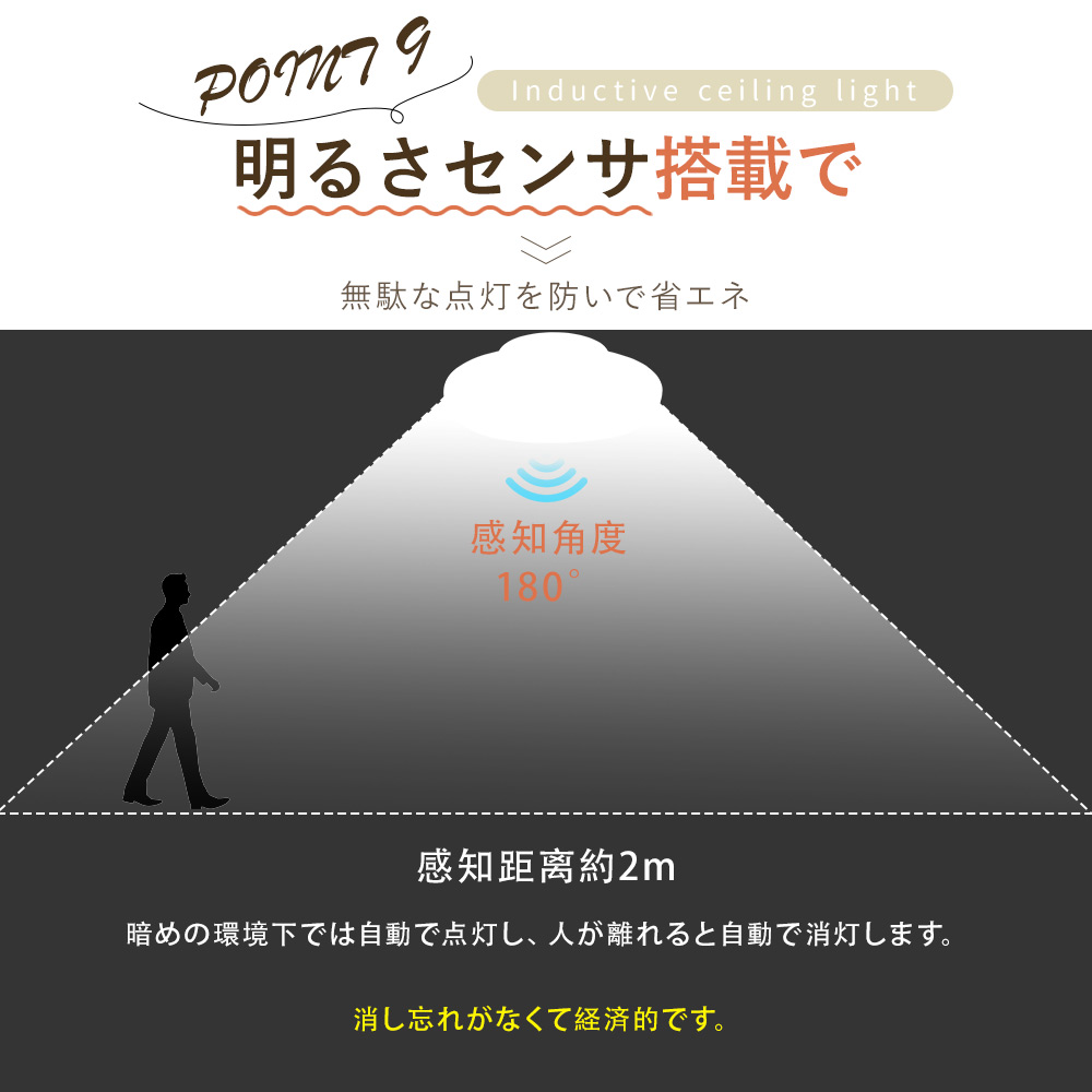 明暗・人感センサーライト センサーライトで、暗闇の不安を一掃しましょう。シーリングライトの人感センサー機能は約3Mの広範囲で動きを感知し、人が近づけばパッと点灯し、離れれば自動的に消灯。また、明暗センサー機能は、昼間に十分な明るさがある場合はライトが点灯せず、明るさが不足している時のみ反応します。昼間は無駄に点灯する心配なし!ムダな電力消費を抑え、賢くエコなライフスタイルを実現できます。