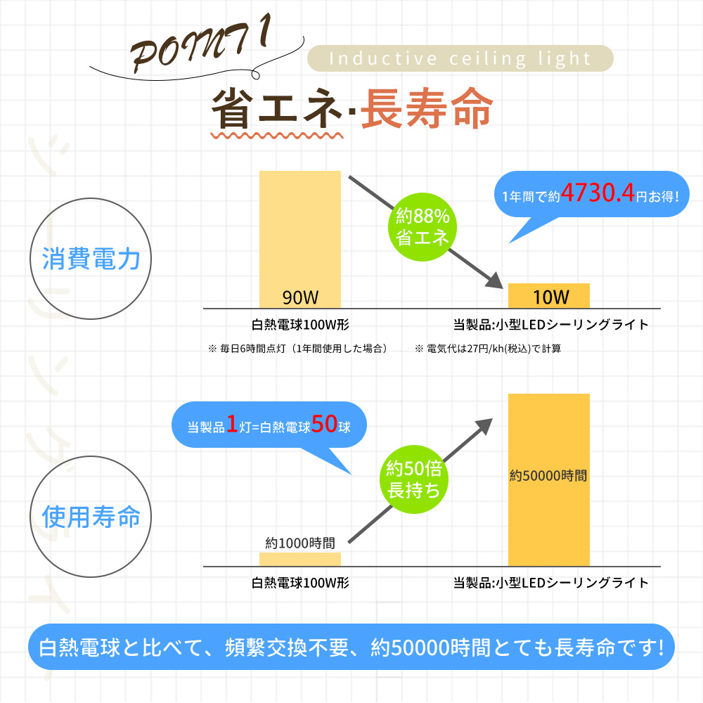50000時間長寿命・省エネ設計 高品質LEDチップ採用で、約50000時間の長寿命を実現。交換の手間やコストを削減します。 消費電力10Wで60W相当の明るさを確保し、従来蛍光灯に比べ約85%の電力削減。電気代も大幅に節約できます。