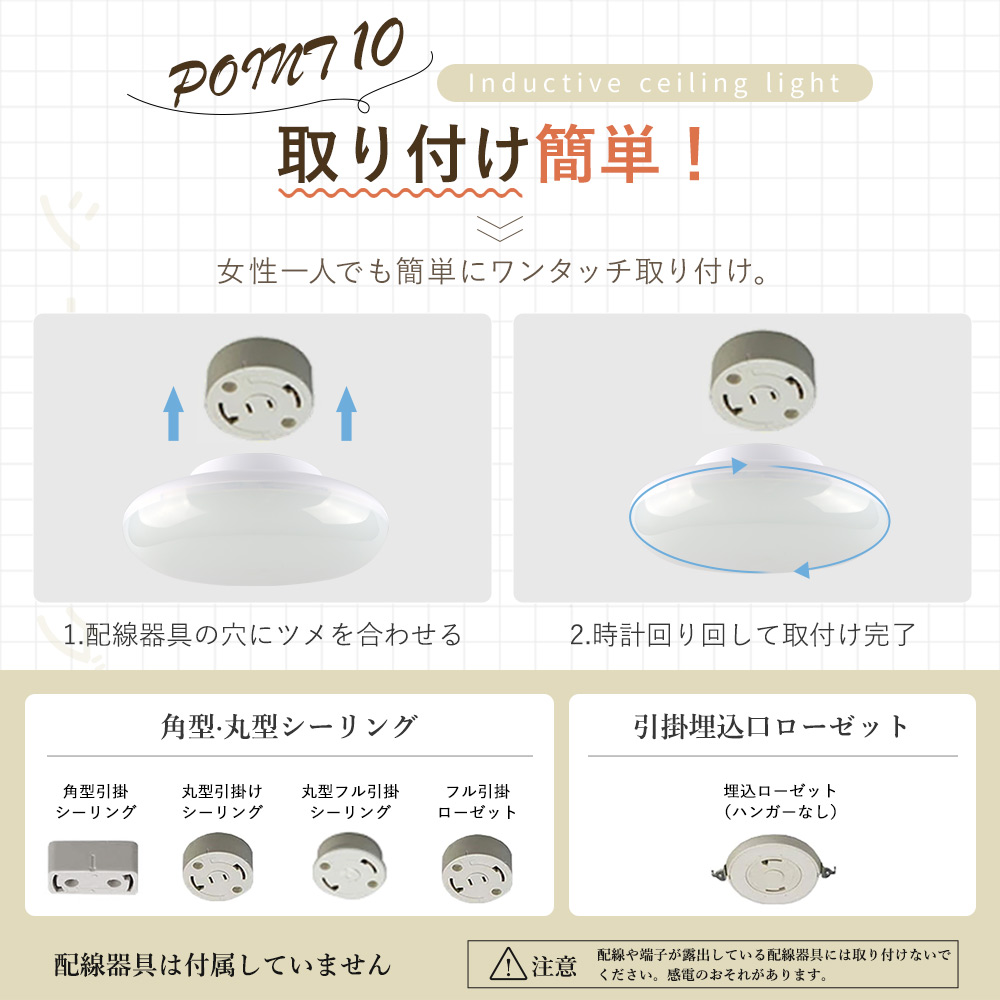 ワンタッチ取り付けで電気工事不要! 工具不要で簡単に取り付けられるため、女性や高齢者でも安心。 新築のお家はもちろん、今お使いのシーリングライトの交換や付け替えもスムーズに行えます。短時間で手軽に設置できるため、引っ越しやリフォームにも最適です。