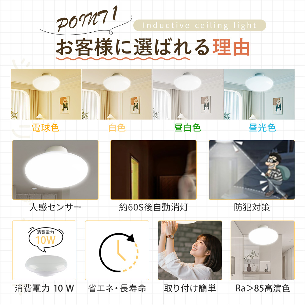 多用途に活躍 人感センサー付きシーリングライトは、玄関・ 廊下・階段・トイレ・脱衣所など、人の出入りが多い場所に最適です。 人の動きを感知して自動で点灯・消灯するため、消し忘れの心配がなく、省エネで快適にご使用いただけます。 家庭用はもちろん、オフィスや店舗などの共用スペースでもスマートに活躍します。