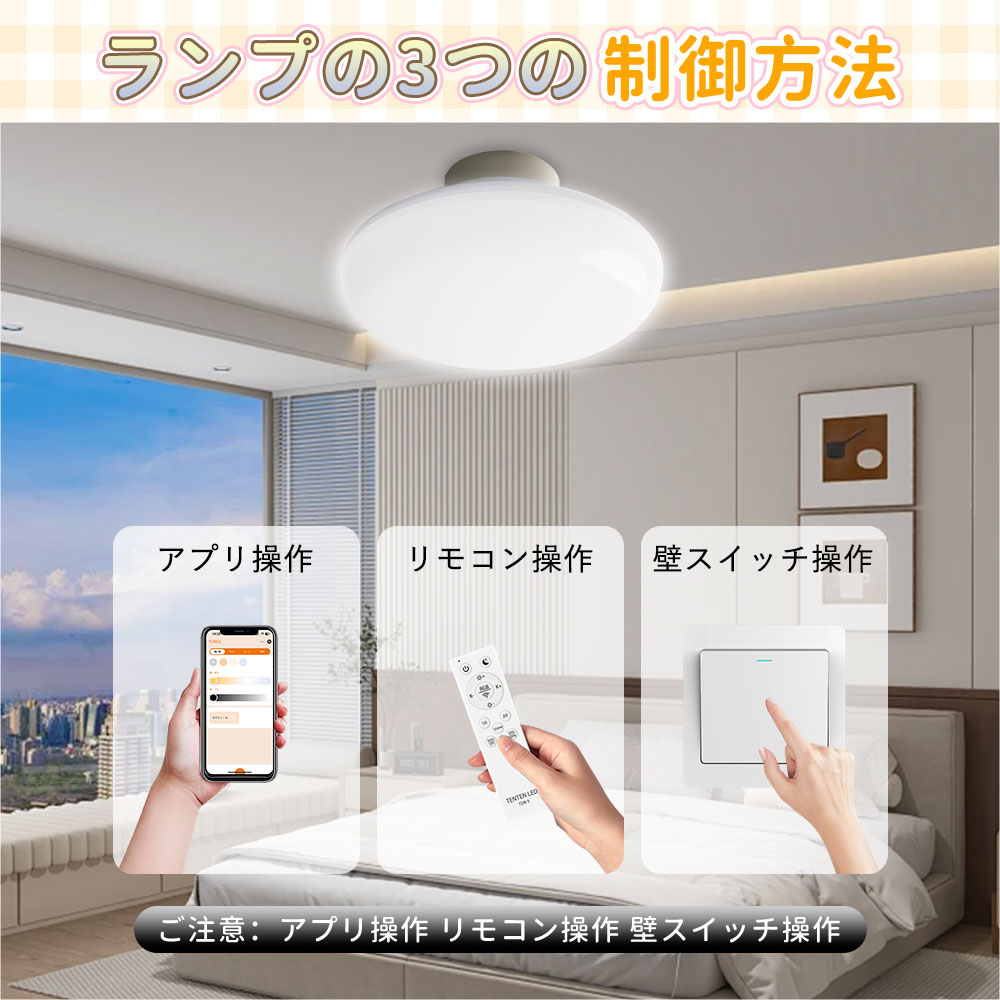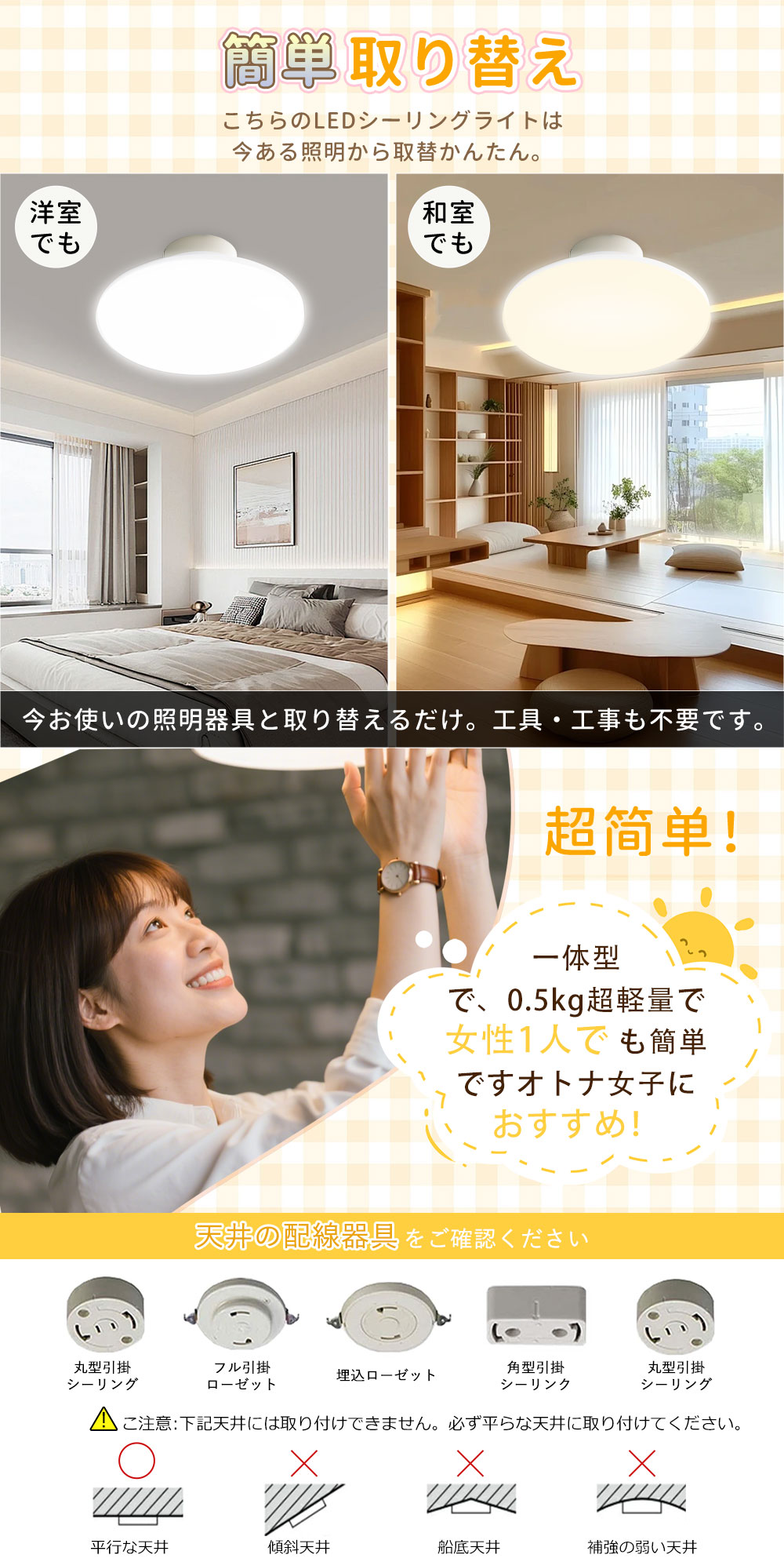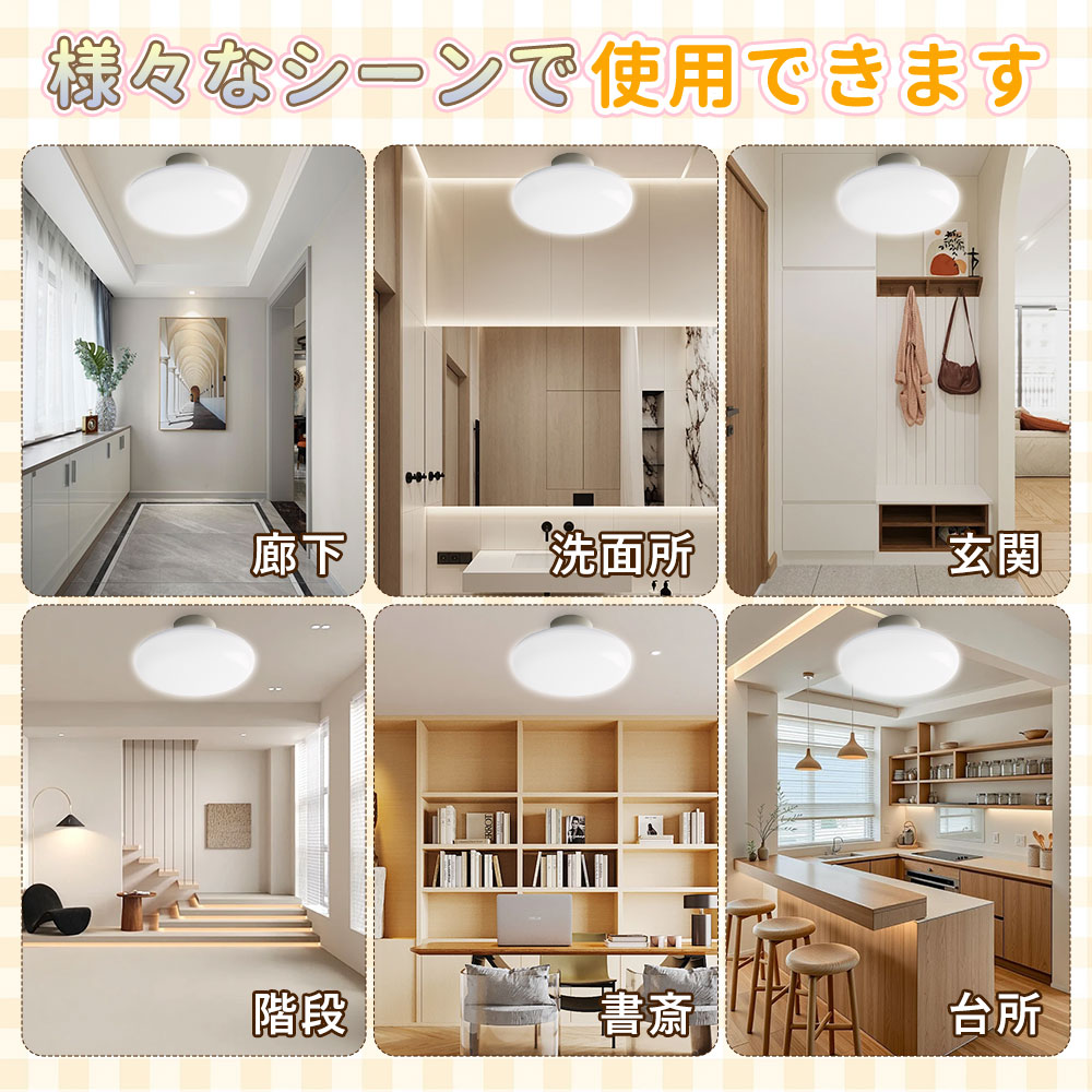 薄型、コンパクト&取付簡単 小型、薄型で収納、持ち運びが便利です、引っ越しでも負担になりません。軽くてコンパクト、アダプターと本体一体型なので、取り付け工具・工事も不要、日本語取扱説明書に記載である取付方法によって高齢者、女性でも商品簡単に取り付けできます。明かさ十分、〜6畳までの部屋に適切です。リビングルーム、ダイニング、寝室、オフィス、トイレ、洋室、和室、部屋、居間など様々のところで活躍られます。 ★警告:感電や怪我を防ぐため、取り付けまたは取り外しの前に必ず電源を切ってください。