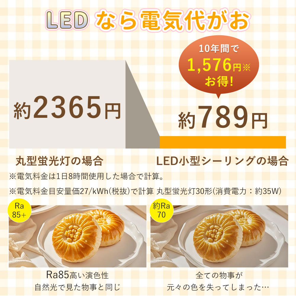 均一発光・優れた演色性・長寿命 高品質なLEDチップを採用し、隅々まで均一に配置しており、照明効果が均一、より明るいです。本製品は演色性に優れたLEDを搭載し、演色性はすべてRa80以上を実現。自然の太陽光に近い波長を実現し、目に負担をかけない高演色性。お食事シーンはもちろん、読書や歓談の際にも効果的。より自然に近い光で、くつろぎの空間を作ります。消費電力は蛍光灯の約半分!お部屋全体を美しく照らす同時に、電気代も抑えられます!放熱性のいいアルミ材質を採用し、設計寿命は一般的なLEDより長めで50,000時間に達します。