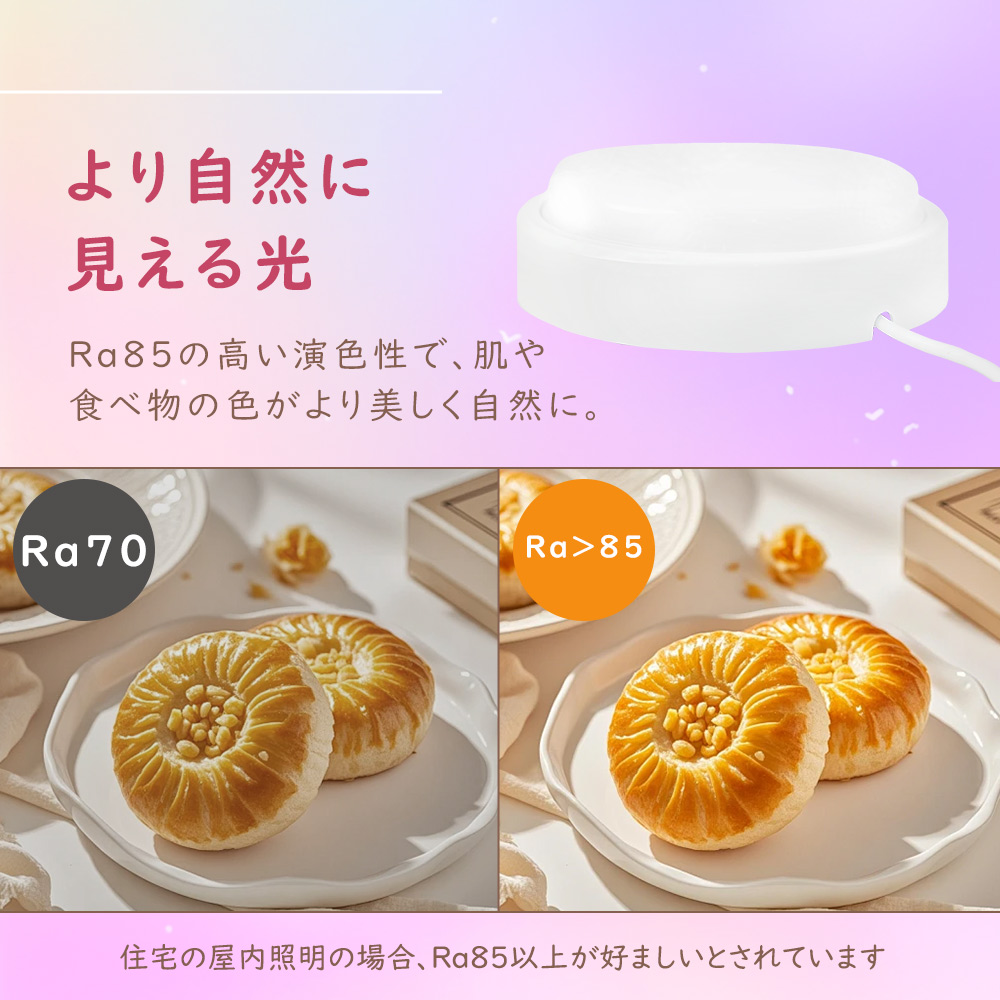 高演色ライトは、照らす空間全体の印象を明るく、美しく引き立てます。 単なる無機質な白い光ではなく、温かみと奥行きを感じさせる自然な光で、家具や壁の色もより鮮やかに再現。 リラックスできる心地よい空間を演出し、長時間過ごしても疲れにくい快適な明かりを実現します。