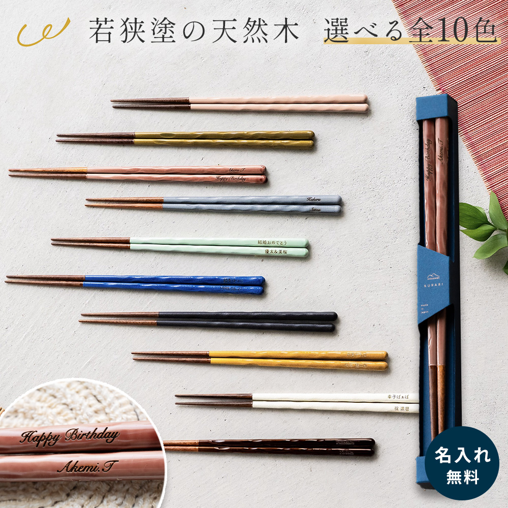 | KURABI 箱入り一膳箸 若狭塗の天然木 選べる全10色 日本の伝統と現代の暮らしを結ぶ逸品 天然木の風合いと美しいカラーリングが合わさり、 名入れも入れることで、世界にひとつだけの特別なお箸として大切な方の贈り物に最適です。 こんなお悩みありませんか? □プラスチック製の箸は軽すぎて使いづらい・・・ □木製の箸は素敵だけど、すぐに傷んでしまう □家族それぞれの箸を区別したいけど、見た目の統一感も大切にしたい 「KURABIの箸が叶える、毎日の小さな幸せ」 箸先の滑り止め加工と丸みのある形状で食べやすい 「使いやすさと耐久性を配慮した、KURABIの箸」 表面塗装により傷つきを防ぎ、長くお使いいただけます。 食洗機対応で忙しい日常でもお手入れが簡単! 「家族や来客用に色違いでそろえることで食卓に彩りを」 滑らかなツヤ感からマットな質感まで、様々な表情を持つ10色展開。 年齢や性別を問わず使いやすいユニバーサルデザインです。 「贈る相手に合わせてカラー選びもプレゼント選びの醍醐味」 ・成人式や誕生日のギフトに 淡い色味が好きな方には、淡桃釉色、青磁色、鉄色、和洋問わずテーブルや食事を引き立ててくれる、黄磁色、緑釉色、飴色など人気色として選ばれています。 ・結婚お祝いに 新生活をイメージさせる白釉はいかがでしょうか? 新婦へ茜色、新郎には瑠璃色のようにペアでのプレゼントもおすすめです。 ・父の日、母の日のプレゼントに クラシックな印象な黒ゆず色や鉄色、瑠璃色などは父や男性に贈りやすいお色味、明るい暖色系の茜色や淡桃釉色は母や女性へ贈りやすいお色味です。 「品質へのこだわり 日本の職人技が生きる一膳」 ネイビーブルーの化粧箱に包まれた姿は、福井の美しい海を思わせる日本の美意識が息づいています。大切な方への贈り物として、また自分へのご褒美としてもふさわしい逸品です。 |