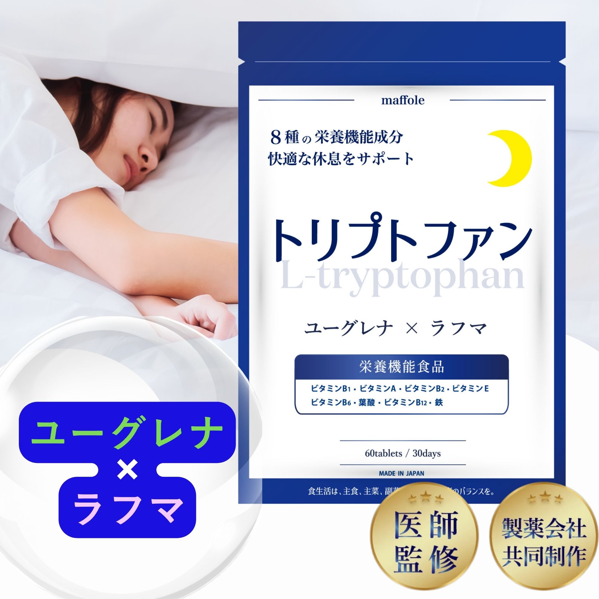 【脳外科医監修xWHO推奨量】 トリプトファン サプリ メラトニン セロトニン 葉酸 鉄 【8種の栄養機能食品×ユーグレナ×ラフマ】 GMP国内工場製造 30日分