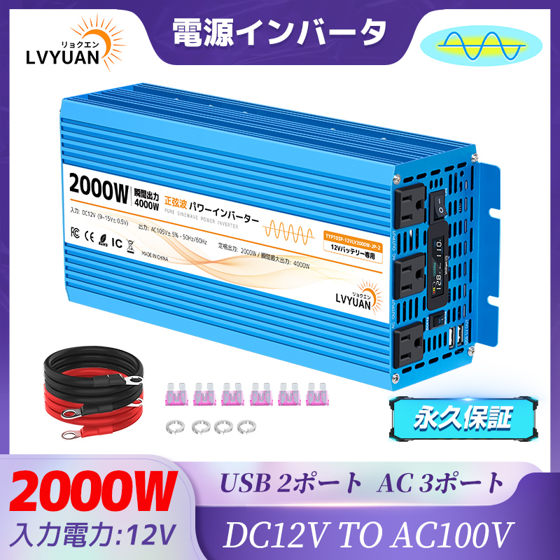 | 2000W正弦波インバーター | ※安心の為自宅と車に必ずキャンプと災害におすすめの大容量正弦波インバーターおきましょう ◆自動車のバッテリーでDC12V直流電力からAC100V交流電力に変換して、定格消費電力2000Wの電子機器に給電可能です。大電量デバイスに充電可、アウトドアや、釣り、キャンプ、旅行、災害時などいろいろな場面で役に立ちます。計画停電対策や防災対策として有効活用が出来ます。 ◆商用電源と同一な高品質な波形で電力を供給することができます。 ◆基本的に、すべての電気機器に使用することができますが、使用機器の最大消費電力を考慮したインバーターを選ぶ必要があります。 |