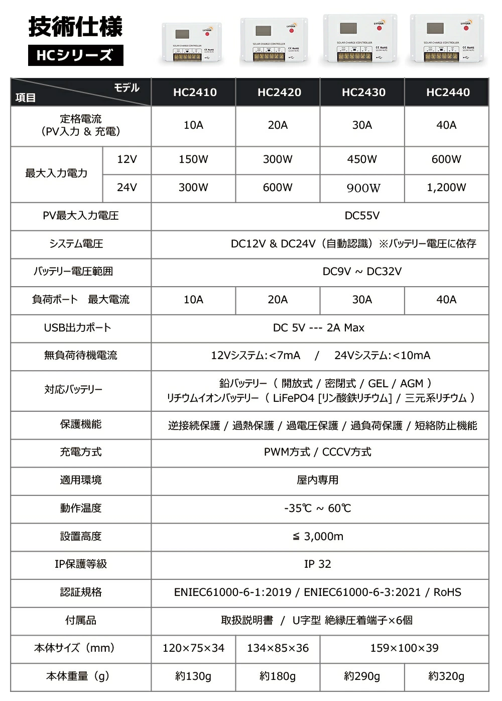 | HC2410 | 最大電流は10A、最大PV入力電圧は50VDC、最大BAT入力電力は12Vシステムで150W、24Vシステムで300Wの仕様となります。 |