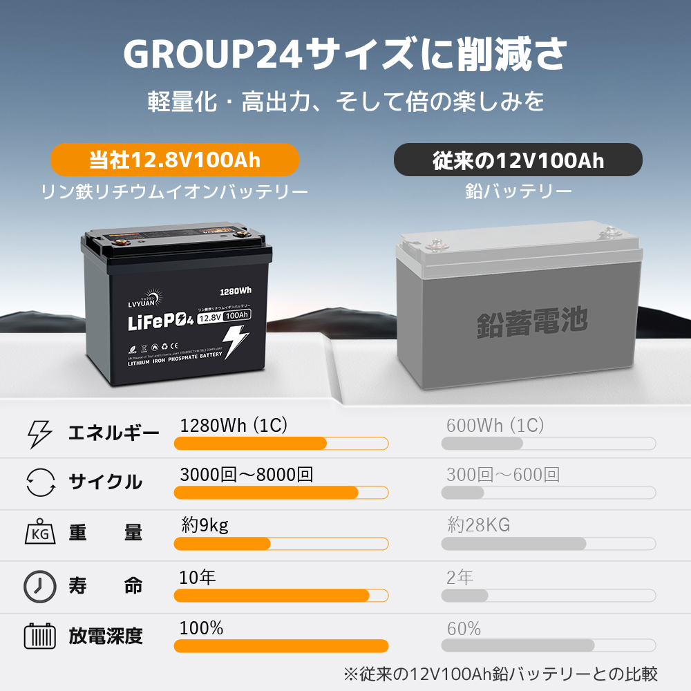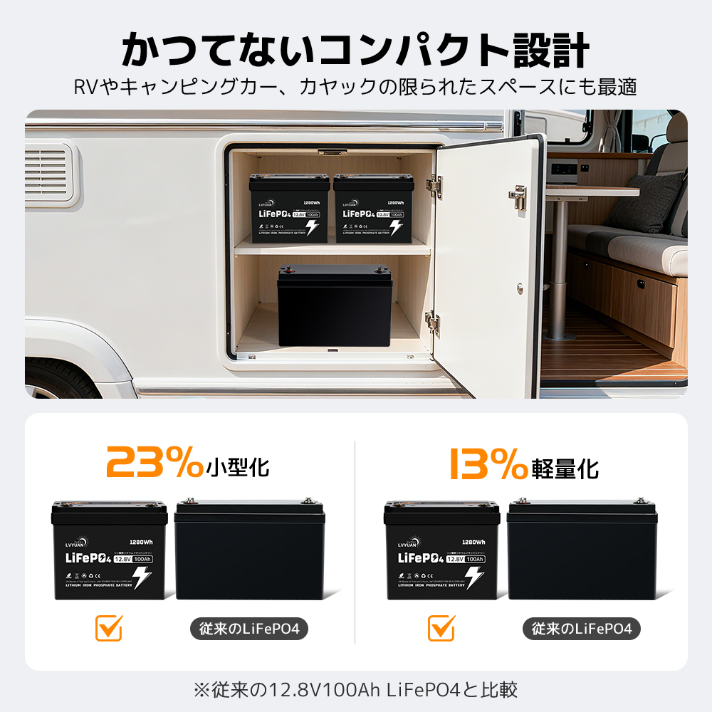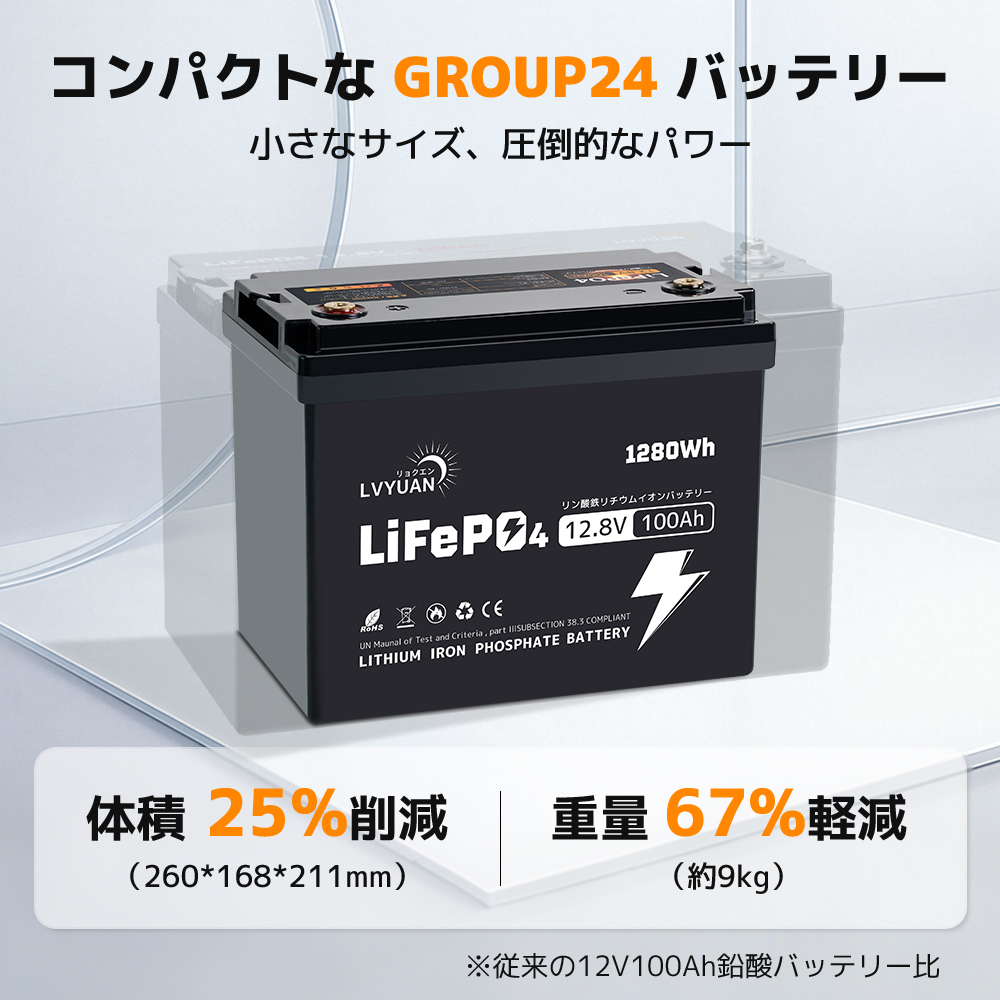 | コンパクトサイズ | GROUP24ケースを採用し、従来の12V 100Ah LiFePO4バッテリーと比較して、サイズを23%縮小、重量を13%軽量化しました。コンパクトなサイズでありながら、同等のエネルギーを実現します!。 |