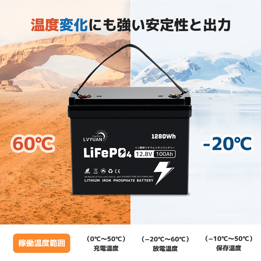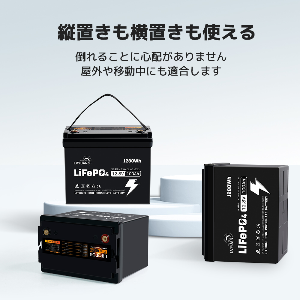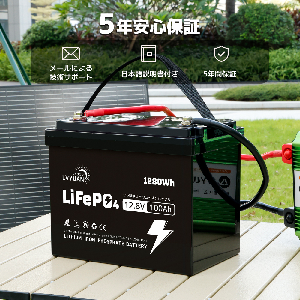 | 高品質と5年保証 | LVYUANの100AHリン酸鉄リチウムバッテリーは、先進的な技術を用いて高性能を実現し、過酷な使用環境にも対応します。製造元のLVYUANは、20年以上の業界経験を持ち、100万人以上のユーザーに支持されています。日本国内に倉庫を設け、迅速なサポートと日本語での取扱説明書を提供しており、品質と信頼性にこだわります。 | 安全性 | 完全に密閉されたハウジングで、電池の漏れ、酸性ミスト、腐食がなく、操作およびメンテナンスのコストを削減します。BMSバッテリ保護システム:安全保護システム:高電圧保護、低電圧保護、過電流保護、高温保護、短絡保護、バッテリーパック容量の自動イコライゼーション。 |