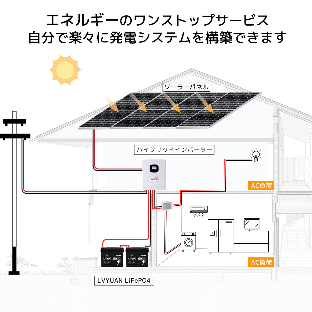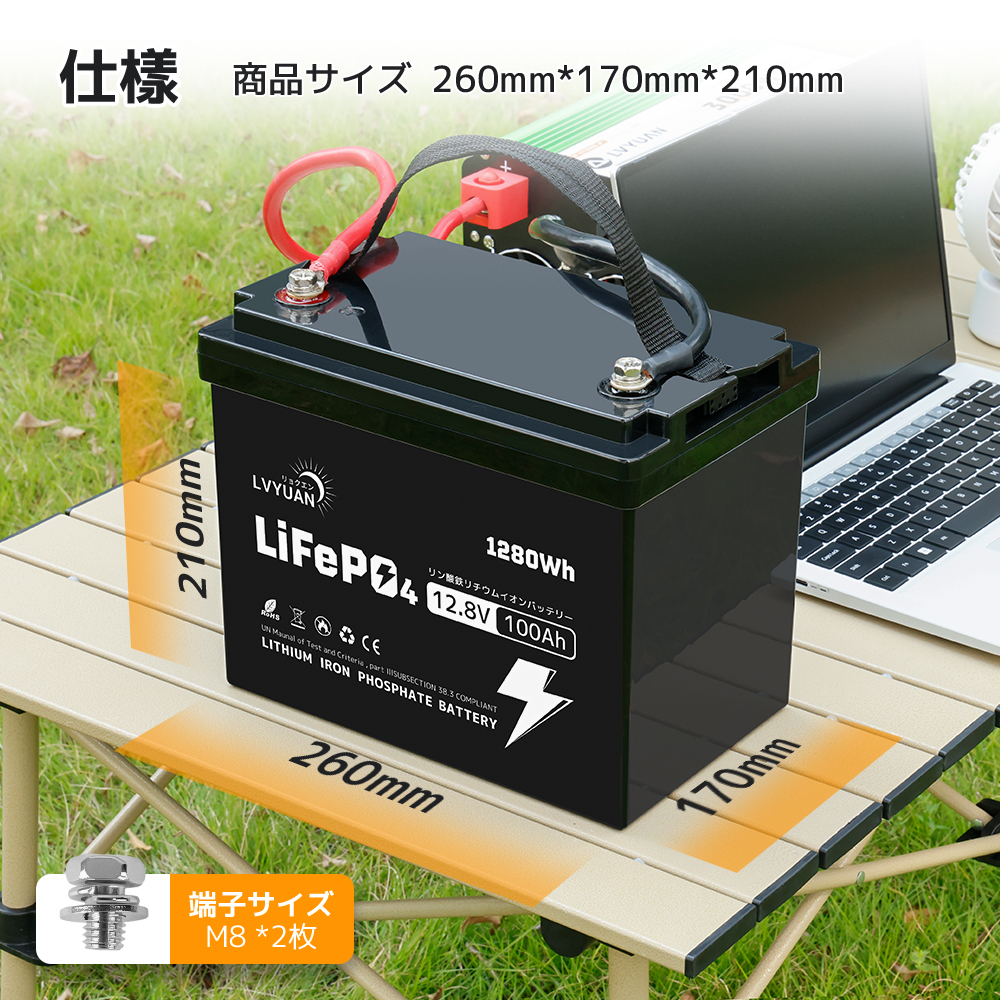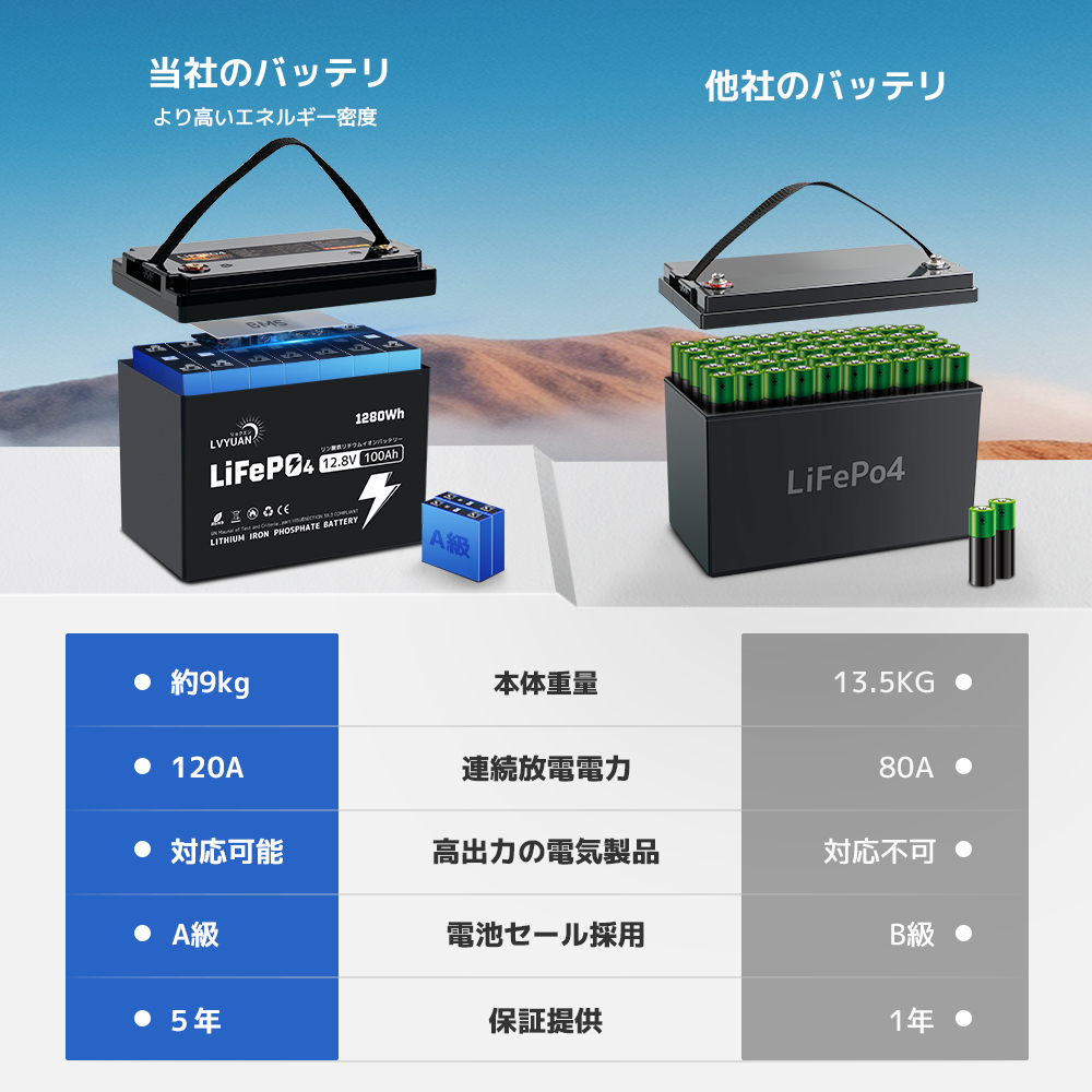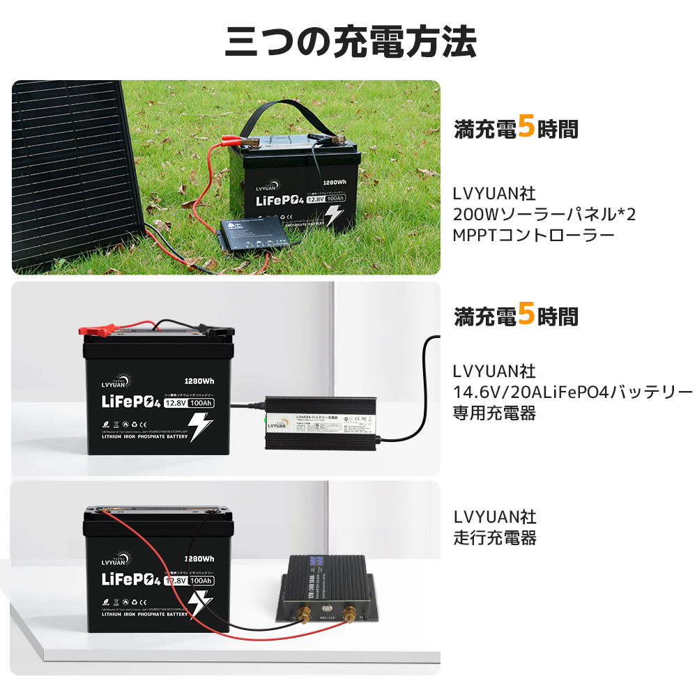 | 高品質と5年保証 | LVYUANの100AHリン酸鉄リチウムバッテリーは、先進的な技術を用いて高性能を実現し、過酷な使用環境にも対応します。製造元のLVYUANは、20年以上の業界経験を持ち、100万人以上のユーザーに支持されています。日本国内に倉庫を設け、迅速なサポートと日本語での取扱説明書を提供しており、品質と信頼性にこだわります。 | 安全性 | 完全に密閉されたハウジングで、電池の漏れ、酸性ミスト、腐食がなく、操作およびメンテナンスのコストを削減します。BMSバッテリ保護システム:安全保護システム:高電圧保護、低電圧保護、過電流保護、高温保護、短絡保護、バッテリーパック容量の自動イコライゼーション。 |