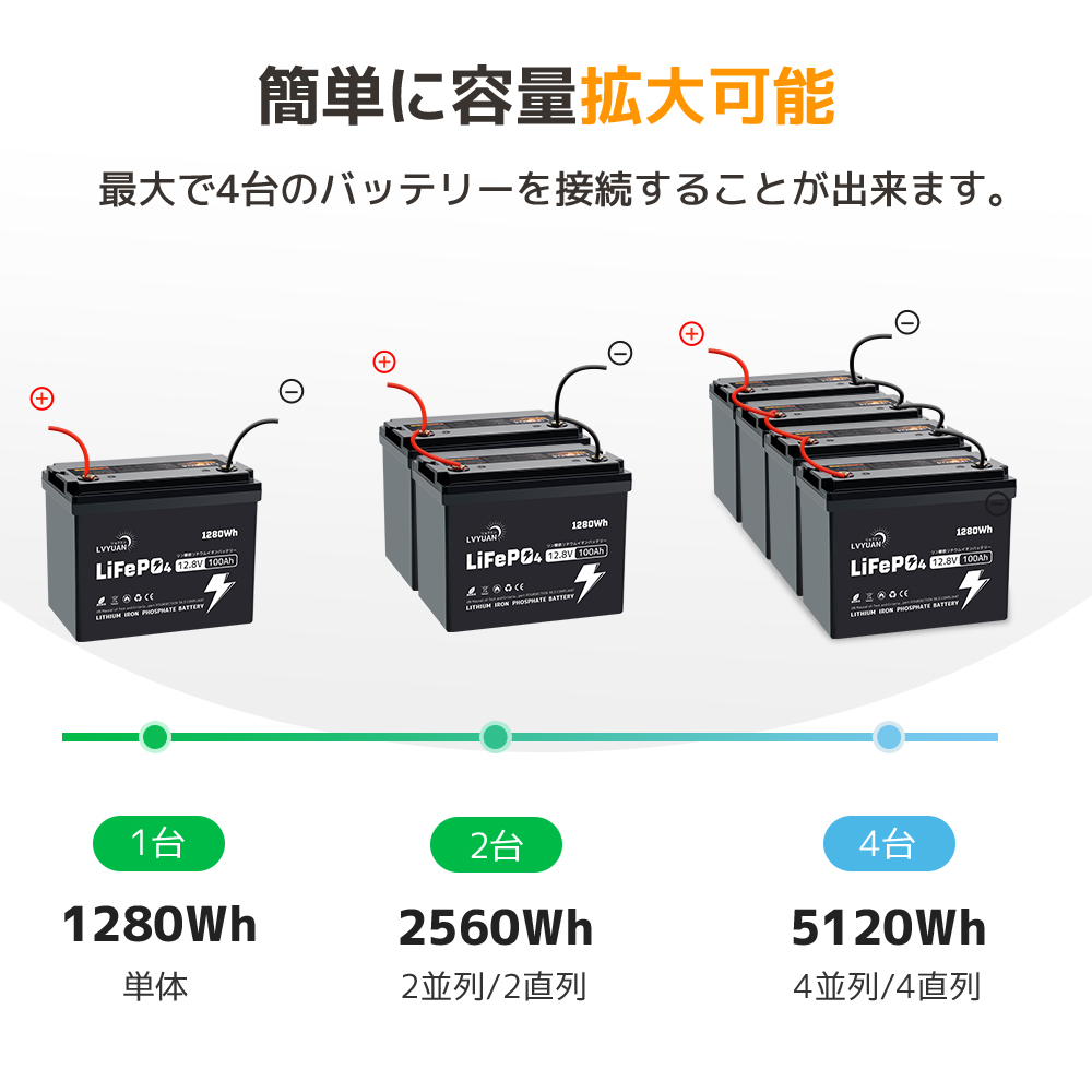 | 安全性を確保するために、バッテリーの適切な取り扱いと設置が重要です。LVYUAN(リョクエン) 100Ah LiFePO4(リン酸鉄リチウム)直列接続により、最大48V(51.2V)100Ah、5.12kWhシステムまで拡張することができます。これ以上容量を拡張する場合、LVYUAN一体式のリン酸鉄リチウムイオンバッテリーを推薦します。最大92.16kWhのシステム拡張が可能です。モジュール構造を採用して、ユーザーにとって使いやすいバッテリーソリューションを提供します。該当バッテリーは、4並列までご利用可能です。ただしバッテリーを並列接続する前に、各バッテリーの電圧差を0.1V以内に充電調整してください。 | |